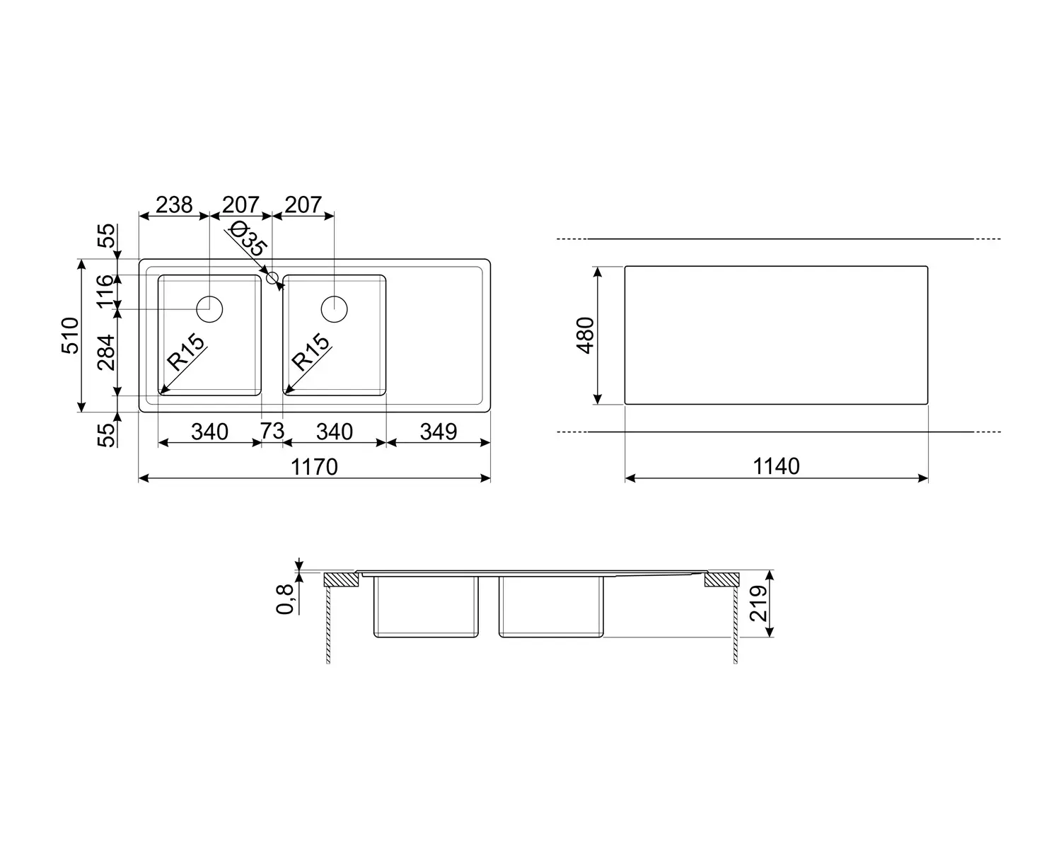- Promień zaokrąglenia zlewozmywaka: 15 mm