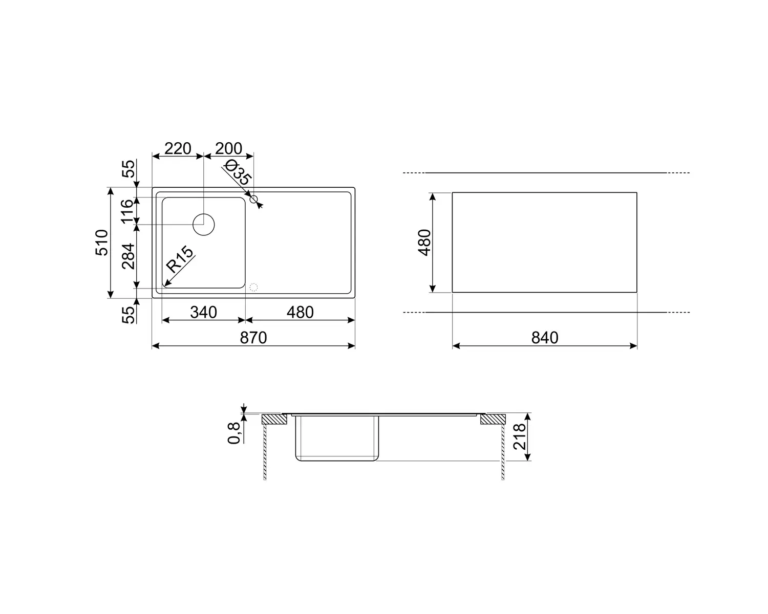 - Promień zaokrąglenia zlewozmywaka: 15 mm