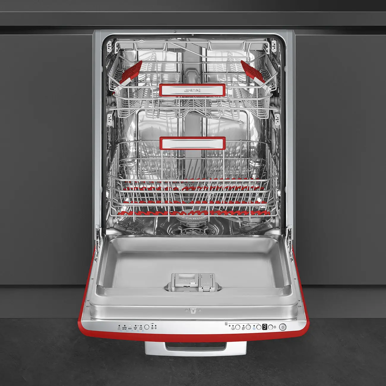 Zmywarka do zabudowy w kolorze czerwonym od firmy Smeg z wyjątkowej linii produktów 50’s Style to propozycja dla wszystkich miłośników stylistyki Retro oraz nowoczesnych rozwiązań kuchennych, gdzie wyjątkowy design pozwala stworzyć unikalny wystrój swojej stylowej kuchni.