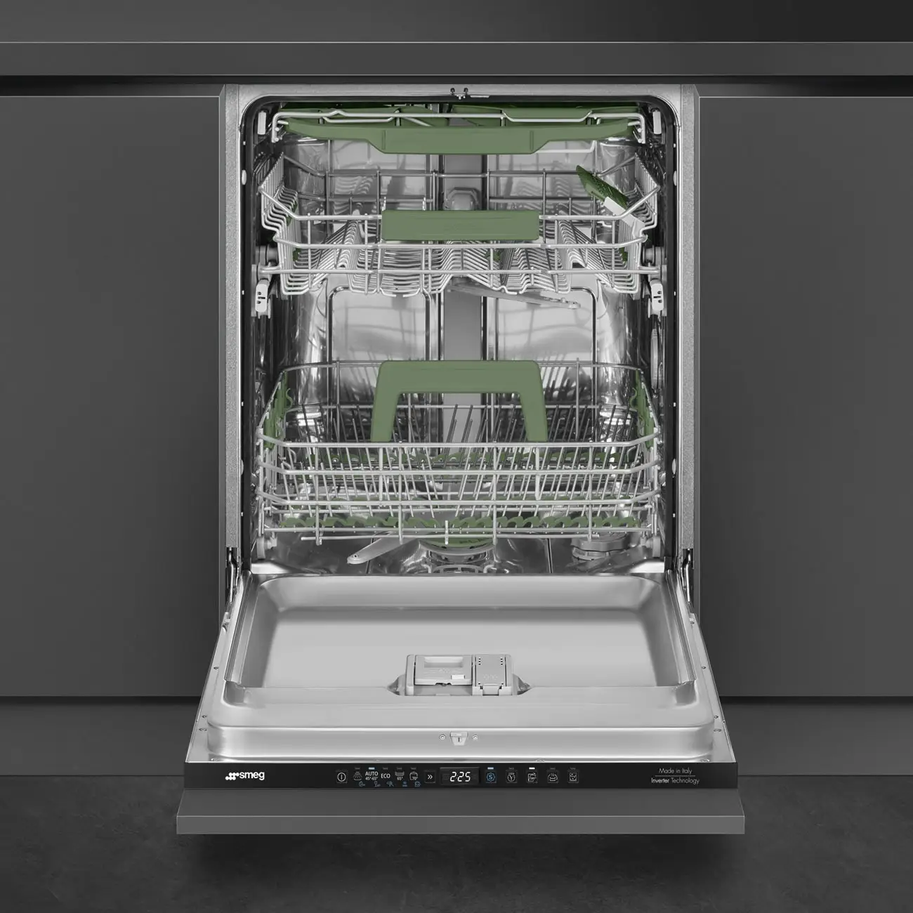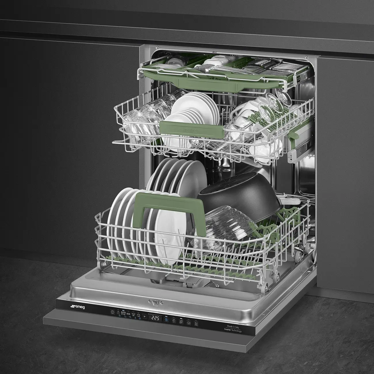 Opatentowany przez SMEG system planetarnego zmywania zapewnia bardzo dokładne mycie naczyń dzięki podwójnemu ruchowi ramienia spryskującego, który równomiernie rozprowadza wodę w całej komorze.