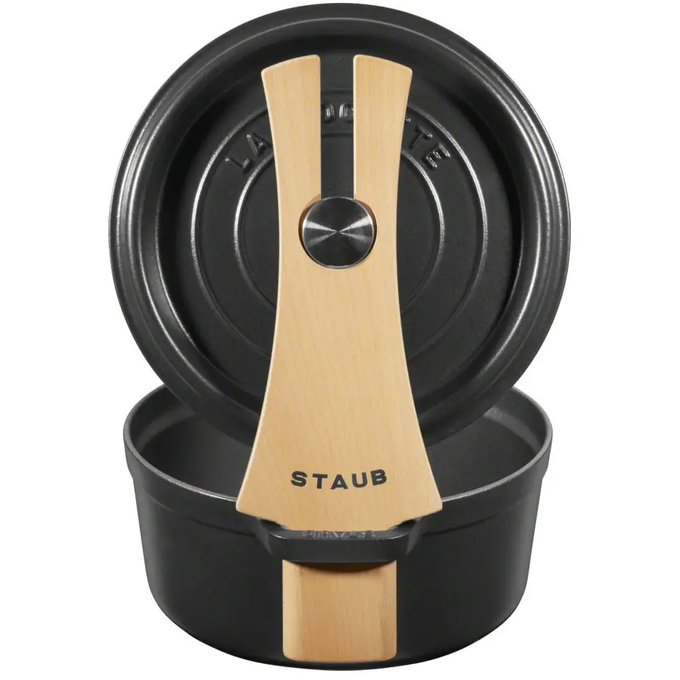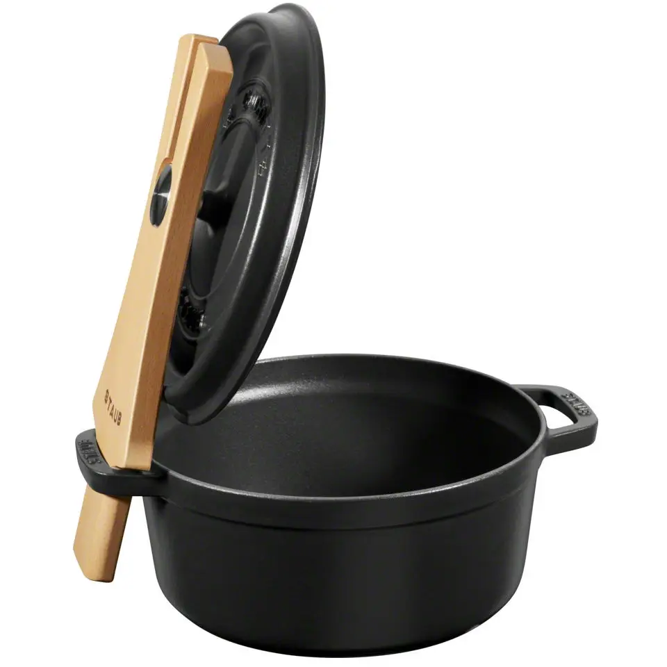 Jedną z właściwości żeliwnych garnków Staub jest ich spora waga oraz niejednokrotnie duże rozmiary, a podanie dania wymaga zdjęcia masywnej pokrywy, co w przypadku dużych rozmiarów może być kłopotliwe. By ułatwić nam serwowanie potraw przyrzadzanych w żeliwnych garnkach Staub firma ta stworzyła drewniany uchwyt na pokrywkę. Za pomocą tego przyrządu zawiesimy pokrywkę mocując go na uchwycie garnka. Uchwyt wykonany jest z drewna bukowego.