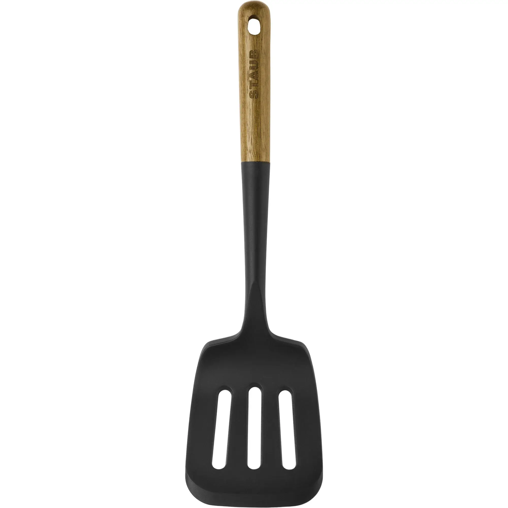 Szpatułka silikonowa 31 cm marki Staub powstała z przeznaczeniem do serwowania wszelkiego rodzaju ciast lub zapiekanek; przyda się tez podczas smażenia.. Wykonana jest z silikonu, dzięki czemu doskonale nadaje się do naczyń z delikatna powłoką, zapobiegającą przywieraniu, a także do naczyń ceramicznych. Osadzona jest na drewnianym trzonku z otworem do wieszania na haku.