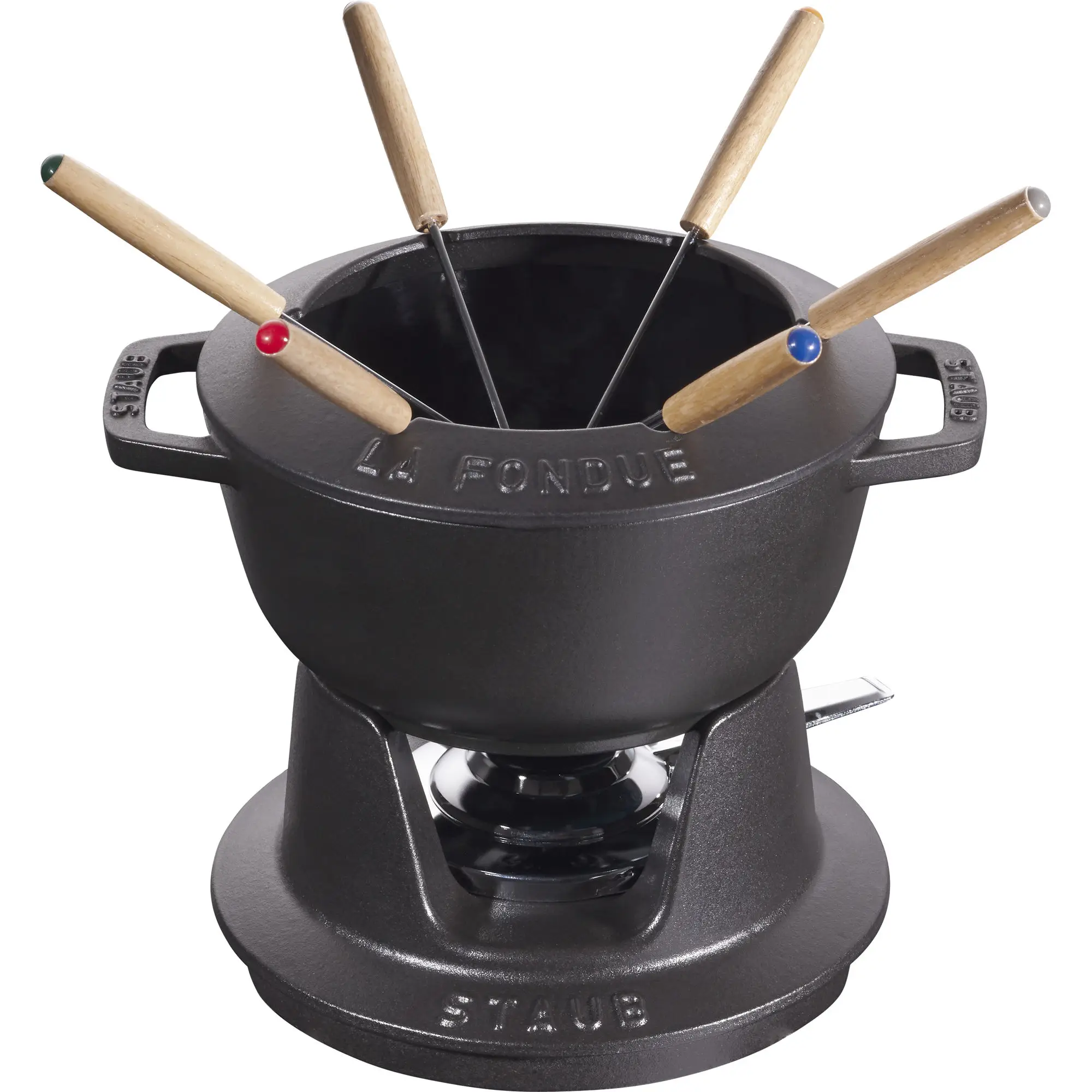 Zestaw do fondue Staub 18 cm czarny to jeden z jej produktów. W skład jego wchodzi żeliwny palnik, żeliwny garnek z wygodnymi uchwytami i pierścieniem z gniazdkami na widelce oraz sześciu widelców, wykonanych jest ze stali nierdzewnej i posiada drewniany trzonek.