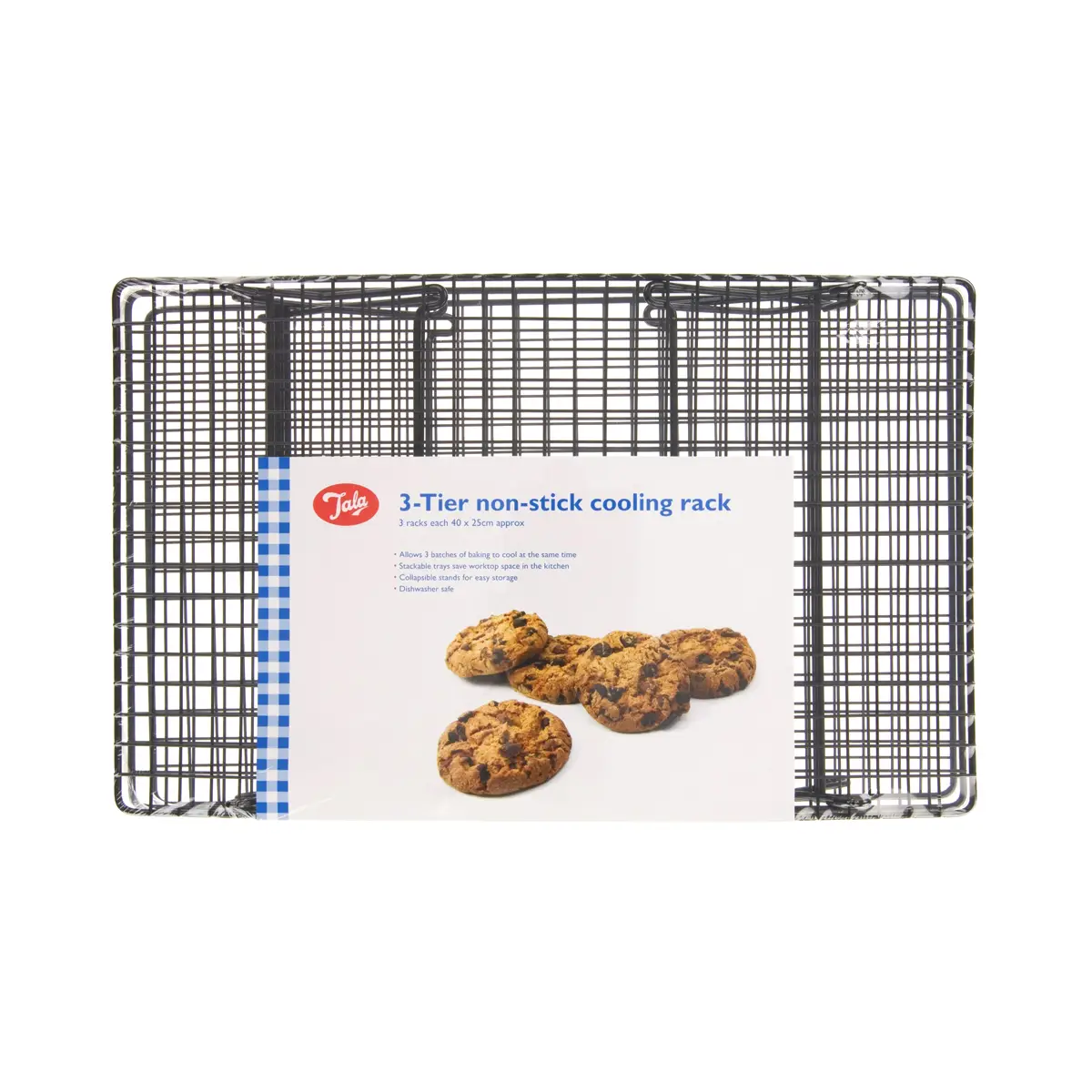 Trzy poziomowa kratka marki Tala świetnie sprawdzi się do studzenia większej ilości wypieków. Wykonana jest z wysokiej jakości metalu z powłoką nieprzywierającą. W przypadku bardzo delikatnych ciast zaleca się wyłożenie kratki papierem do pieczenia. Stopki utrzymują kratkę nad blatem, co zapewnia cyrkulację powietrza i przyspiesza proces studzenia. Części można używać pojedynczo, lub w przypadku większej ilości ciast złożyć jedna na drugiej. Można myć w zmywarce, a po użyciu złożyć na płasko.