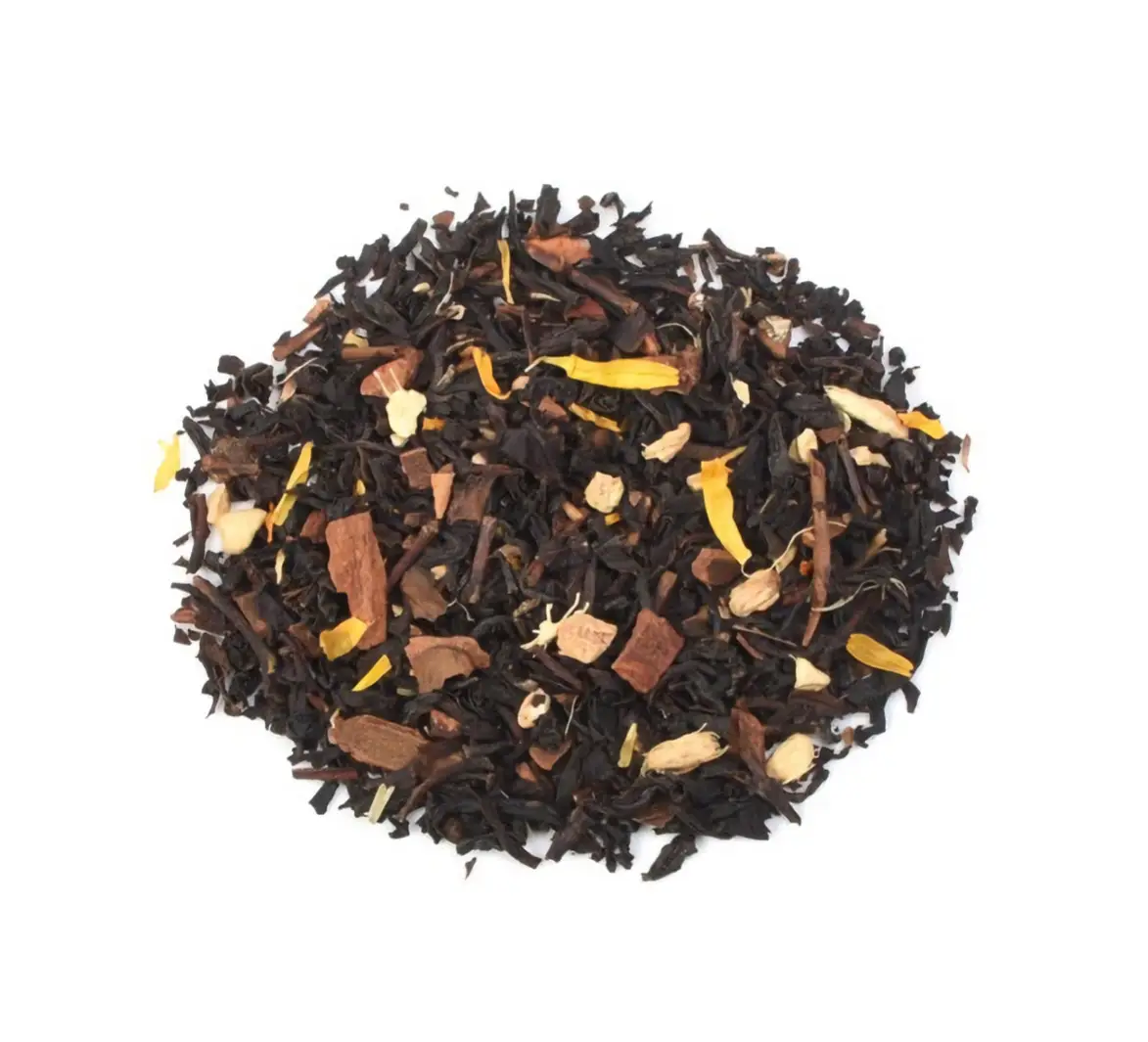 czarna herbata (Chiny & Indie), przyprawy (cynamon (Cinnamomum cassia), imbir), naturalny aromat jabłka, naturalny aromat gruszki, olejek eteryczny z pomarańczy, płatki nagietka