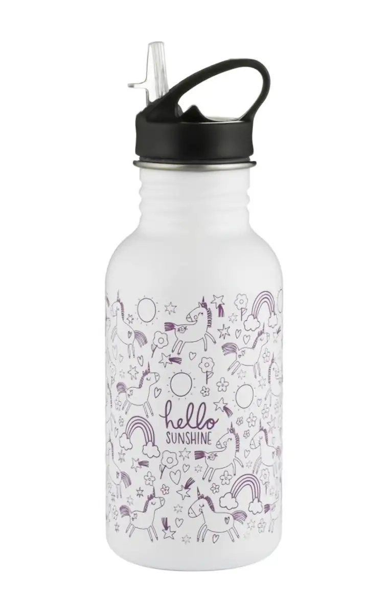 Prezentowana butelka termiczna Gift Box o poj. 550 ml w zamyśle przeznaczona jest dla dzieci i ozdobiona została wzorem Hello Sunshine przedstawiającym jednorożce. Wykonana została ze stali nierdzewnej, dzięki czemu jest trwała. Nie tylko pozwoli na wygodne przenoszenie na zewnątrz ulubionego napoju, ale i bezproblemowe jego spożycie dzięki wysuwanej słomce. Transport ułatwi przy tym dostosowany wielkością do niedużych dziecięcych dłoni uchwyt umieszczony na jej nakrętce. Ciekawym wizualnym efektem produktu jest fakt że pod wpływem temperatury zmienia on swój kolor - poniżej 18°C staje się różowy, a powyżej 18°C wraca do koloru białego. By utrzymać butelkę w czystości należy ją myć wyłącznie ręcznie.