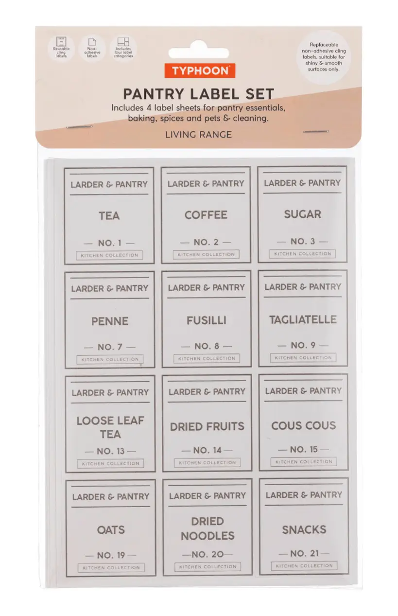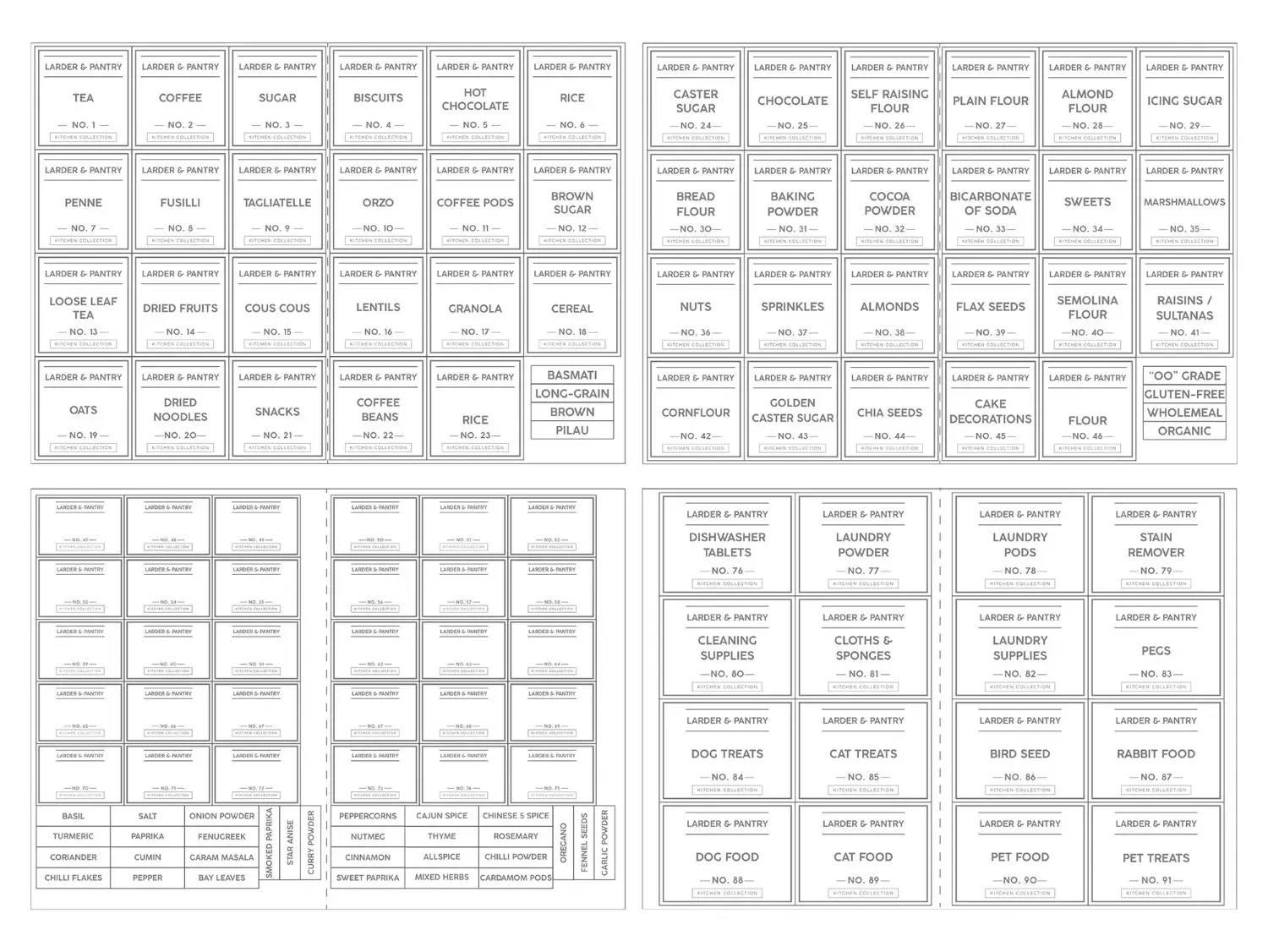 Prezentowany zestaw 4 papierowych arkuszy A4 z 91 etykietami kuchennymi idealnie nada się do opisania artykułów spożywczych, artykułów do pieczenia, przypraw oraz chemii domowej. Mają one minimalistyczny, pasujący do wielu kuchni design i nazwy w języku angielskim. Zestaw przeznaczony jest wyłącznie do gładkich i błyszczących powierzchni np. ceramiki czy szkła. Etykiety nie mają kleju, dzięki czemu można ich używać wiele razy.