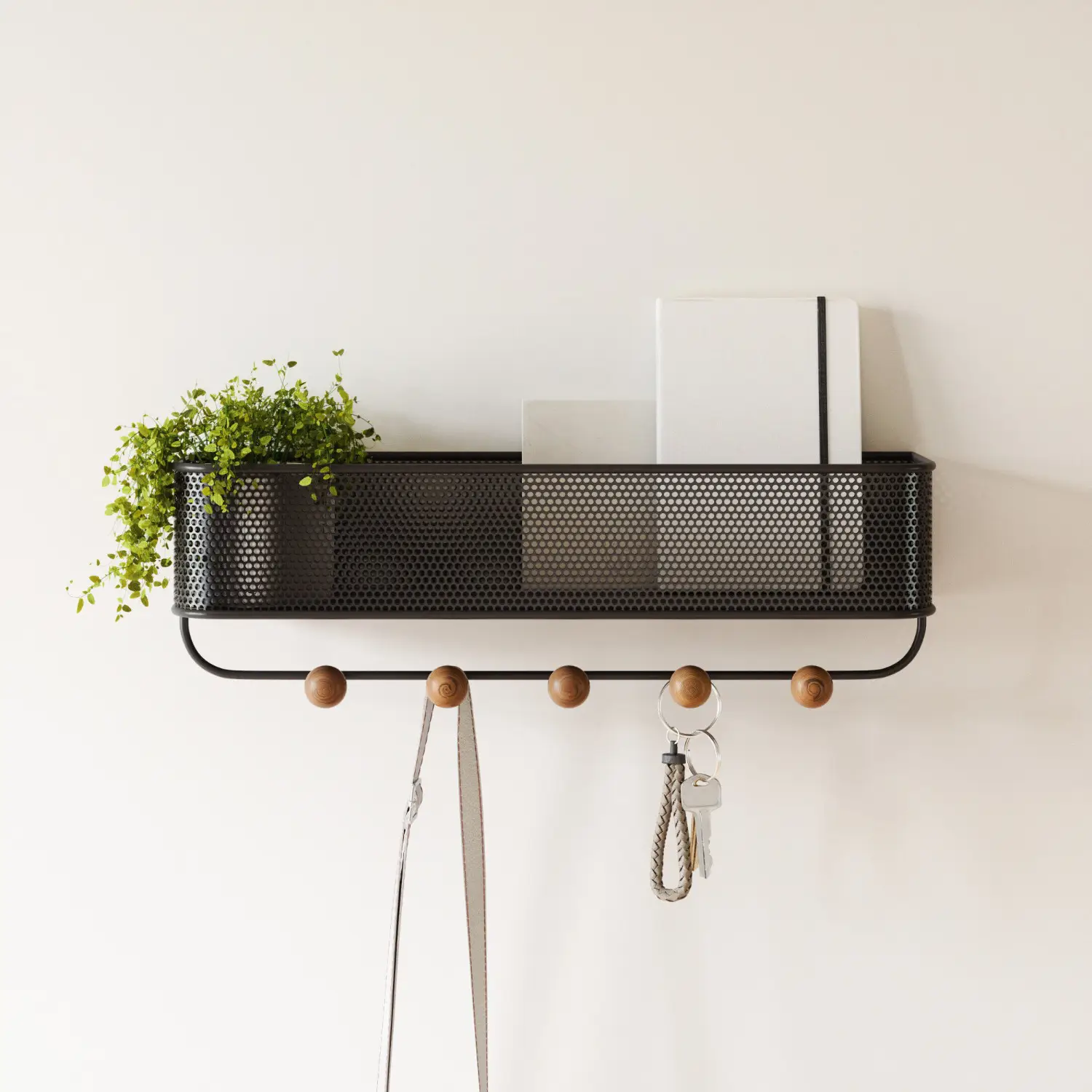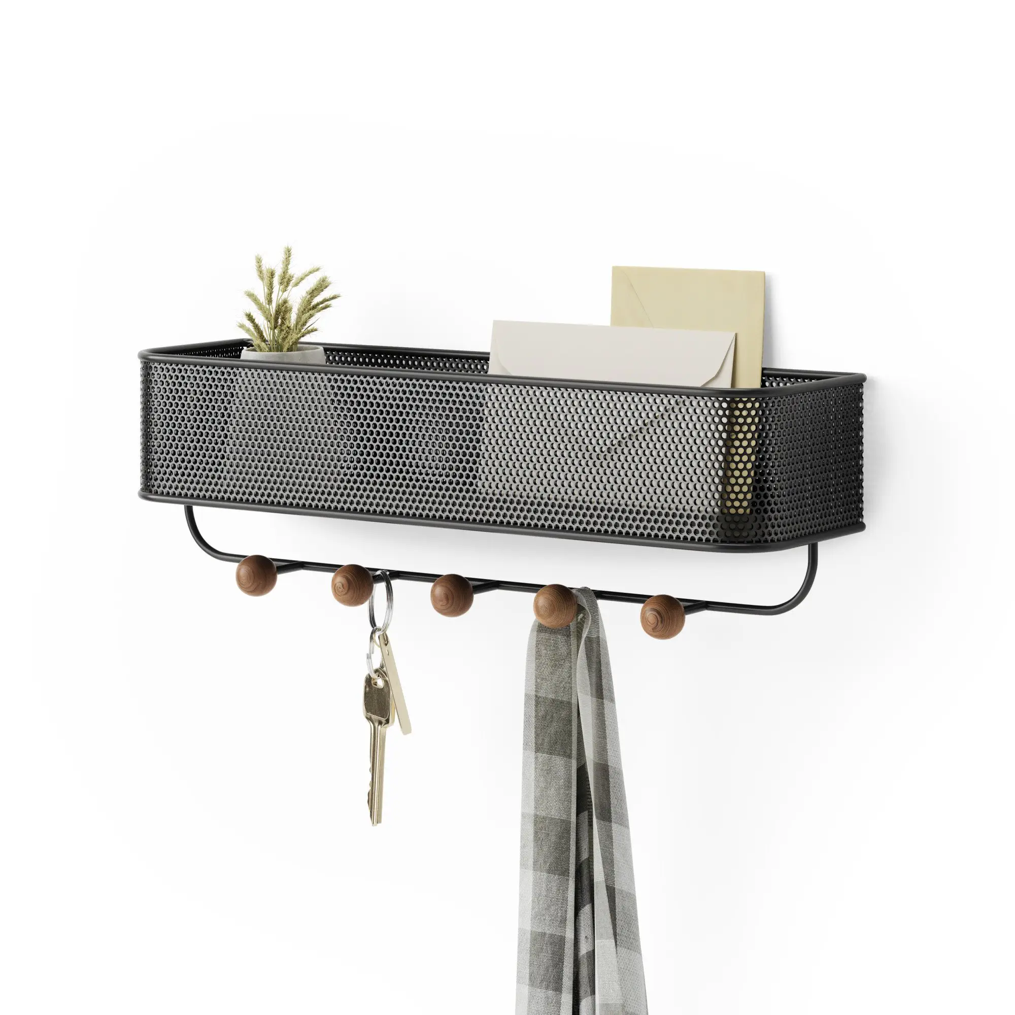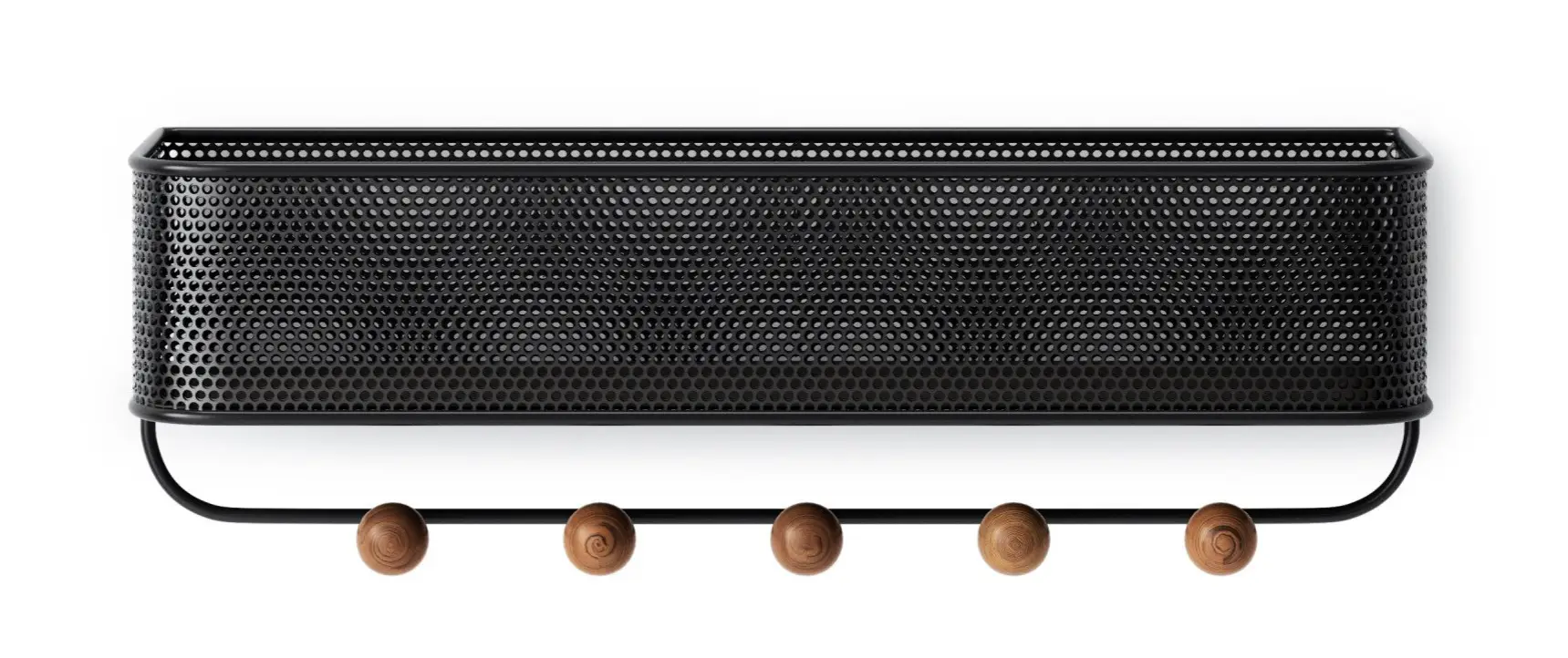 Prezentowany organizer w kolorze czarnym składa się z metalowego perforowanego kosza i pięciu haczyków o drewnianych gałkach. Maksymalne obciążenie jednego z wieszaków wynosi 2,3 kg, po pozwala na zawieszenie różnego rodzaju przedmiotów. Wieszak stanowić będzie doskonałe rozwiązanie do niewielkich wnętrz. Produkt jest łatwy w zamontowaniu - w komplecie dołączono do niego niezbędne elementy, a jego otwory ukryte, co wpływa na estetykę wizualną ściany.