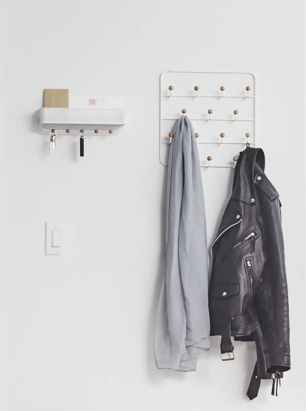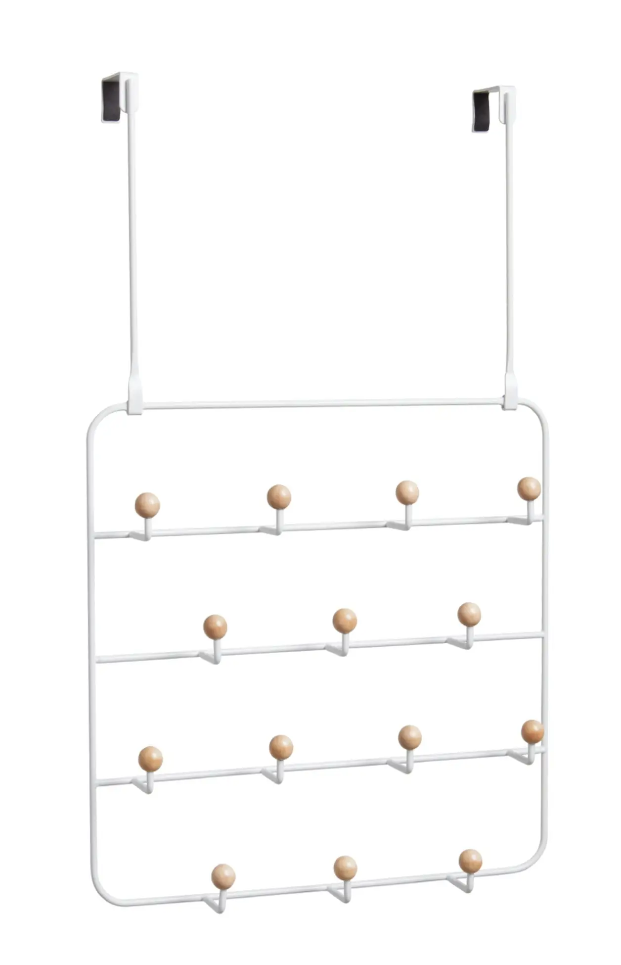 Prezentowany metalowy multi-organizer w kolorze białym ma 14 haczyków, na których można wieszać przedmioty umieszczone w 4 rzędach. Maksymalne obciążenie jednego z wieszaków wynosi 2,3 kg, po pozwala na zawieszenie różnego rodzaju przedmiotów. Każdy z nich posiada kulkę z drewna na końcówce, która chronić będzie delikatne przedmioty przed uszkodzeniami. Produkt jest łatwy w zamontowaniu - w komplecie dołączono do niego niezbędne elementy. Dodatkowo można go zawiesić na dwa sposoby - na ścianie lub na drzwiach przy pomocy dołączonych haczyków.