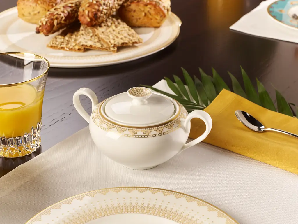 Cukiernica o pojemności 350 ml z linii Samarkand od Villeroy & Boch to część serwisu, w którym delikatne zdobienia oraz orientalny, wyrafinowany przepych łączą się w bajkowe kompozycje na zastawionym stole.