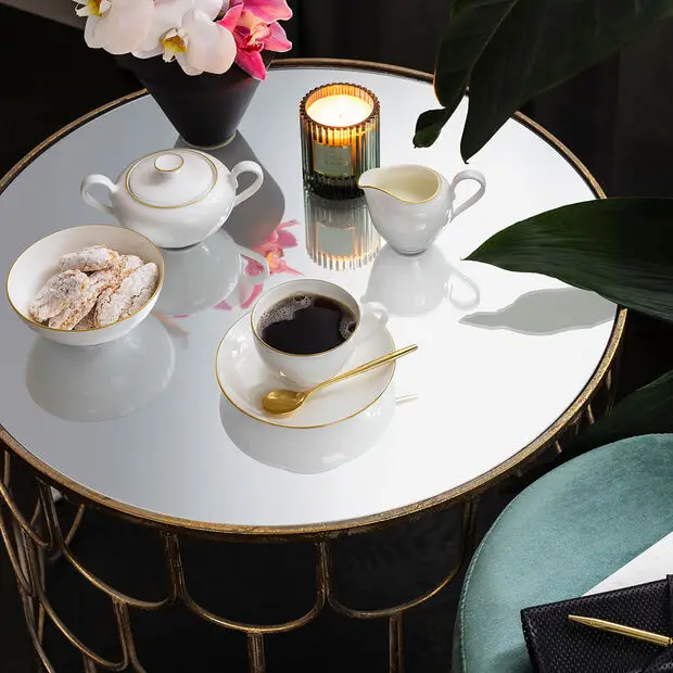 Kolekcja Anmut to hołd złożony latom 50-tym XX wieku w uszlachetnionej formie. Romantyczne zaokrąglenia i ponadczasowy minimalistyczny design nadają tym naczyniom wyjątkowo atrakcyjny wygląd. Wdzięk szlachetnego złota, wesołe motywy lasu deszczowego, indyjskie wzory paisley lub nuta różu i drogocennej platyny: kolekcja Anmut ze względu na swój klarowny styl stanowi wspaniałą bazę dla wielu charakterystycznych dekorów Villeroy & Boch.