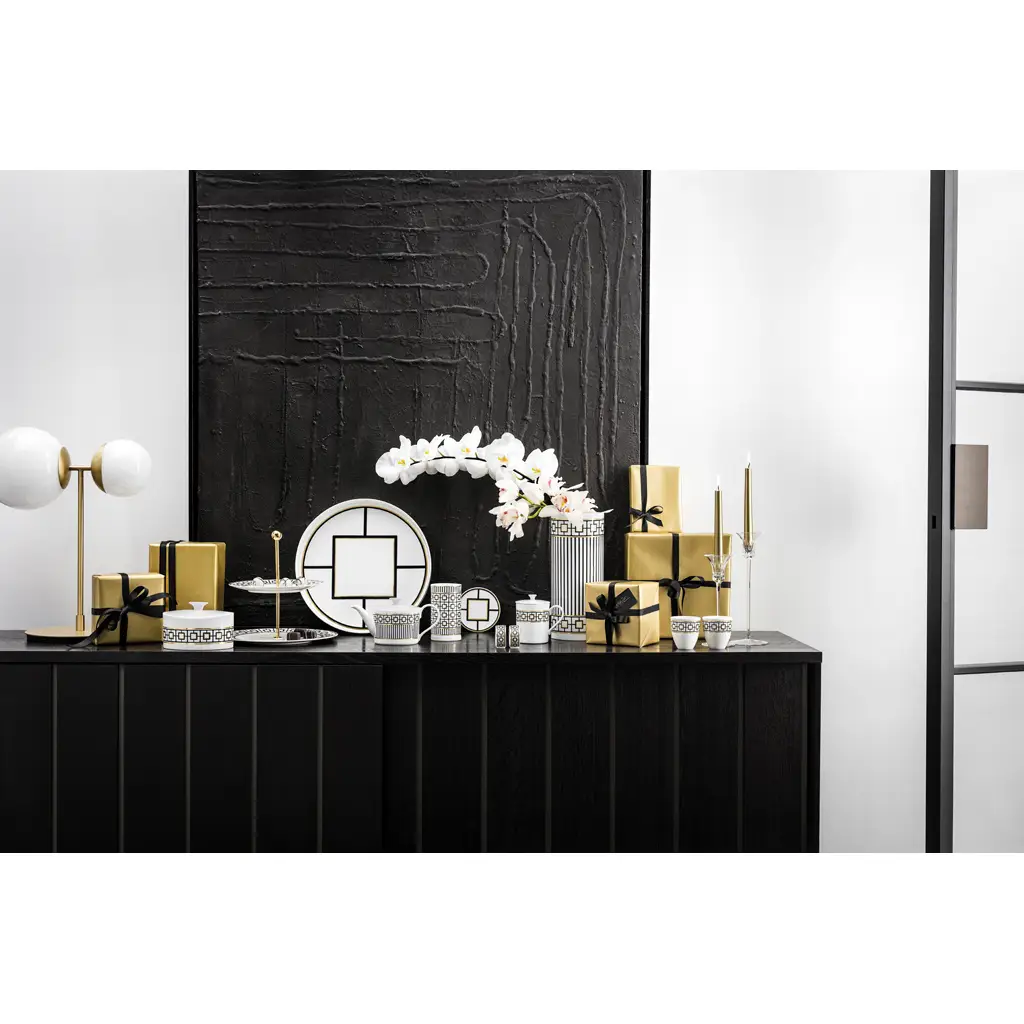Etażerka 2-piętrowa o średnicy 275 mm oraz wysokości 267 mm z serii MetroChic Gifts od Villeroy & Boch jest częścią wytwornej zastawy, cechującej się czarnym i złotym harmonijnym wzorem, która podkreśla elegancję zastawionego stołu.
