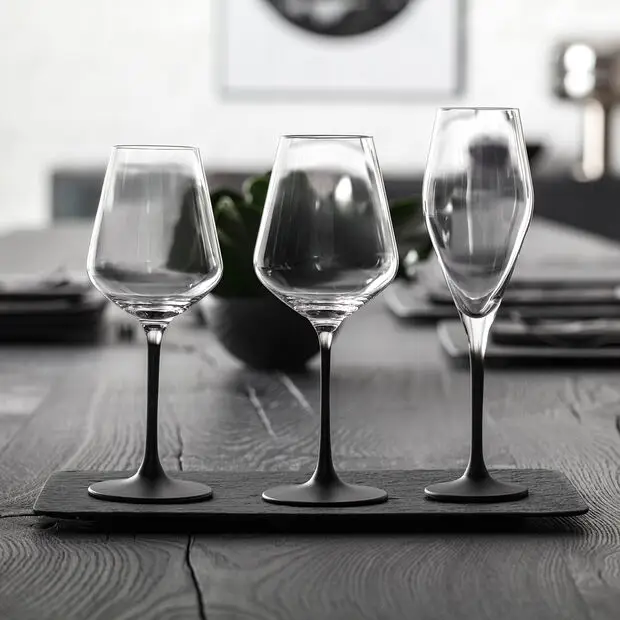 Prezentowany zestaw zawiera 4 kieliszki do białego wina o wymiarach 9 x 22,6 cm i pojemności 120 ml. Wykonane zostały one z przezroczystego szkła kryształowego z czarną nóżką i spodem. Zestaw doskonale nada się na różne okazje - od uzupełnienia codziennych posiłków po specjalne spotkania, umożliwiając podawanie wina w elegancki sposób. Produkt nie nadaje się do używania w kuchence mikrofalowej. Należy go myć ręcznie.
