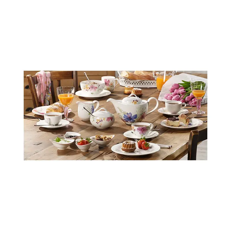 Wzór Mariefleur zaprasza, aby oddać się marzeniom: zainspirowany ogrodami Moneta w Givenchy, przedstawia radosną, kolorową łąkę i akwarelowe kwiaty w intensywnych kolorach purpury i żółci, dzięki którym na nakrytym stole rozkwita letni ogród. Zawsze różne zestawy motywów wydają się przy tym wyrastać z poszczególnych naczyń i stwarzają liczne możliwości nowych kombinacji.