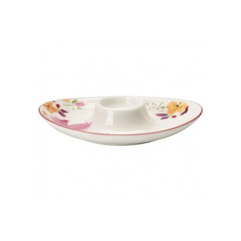 Porcelanowy kieliszek do serwowania jajek na miękko. Kolekcja Mariefleur, niezwykle efektowna i bogata stylistycznie, cieszy wzrok wspaniałą kolorystyką i opływowymi kształtami. Biała porcelana zdobiona polnymi kwiatami w odcieniach fioletu i różu nadaje naczyniom niecodziennego uroku. Świeżość barw i litograficzne wzornictwo umiejętnie łączą nutę nowoczesności z posmakiem tradycji, a całości serii nadają wykwintnego charakteru i atrakcyjności. Naczynia Mariefleur to doskonałe uświetnienie smaku i czaru elegancji.