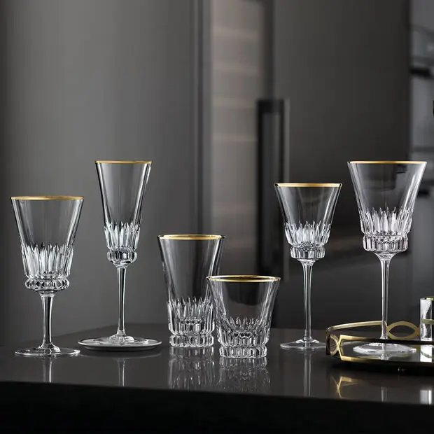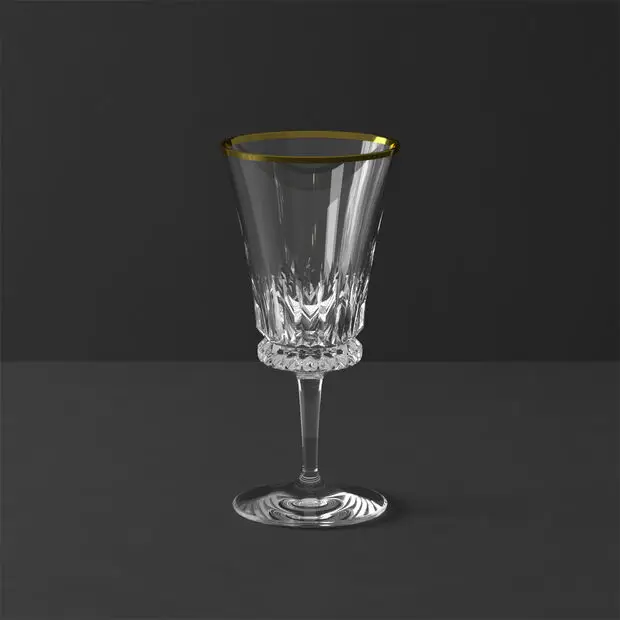 Kolekcja Grand Royal Gold łączy artystycznie szlifowane szkło kryształowe z ekstrawaganckim złotym obrzeżem, tworząc współczesną, ale stylową całość. Bardzo ekskluzywne szkło o delikatnym designie jest dostarczane w wyszukanym kartonowym pudełku. Spraw, aby Twoja zastawa stołowa była idealna.