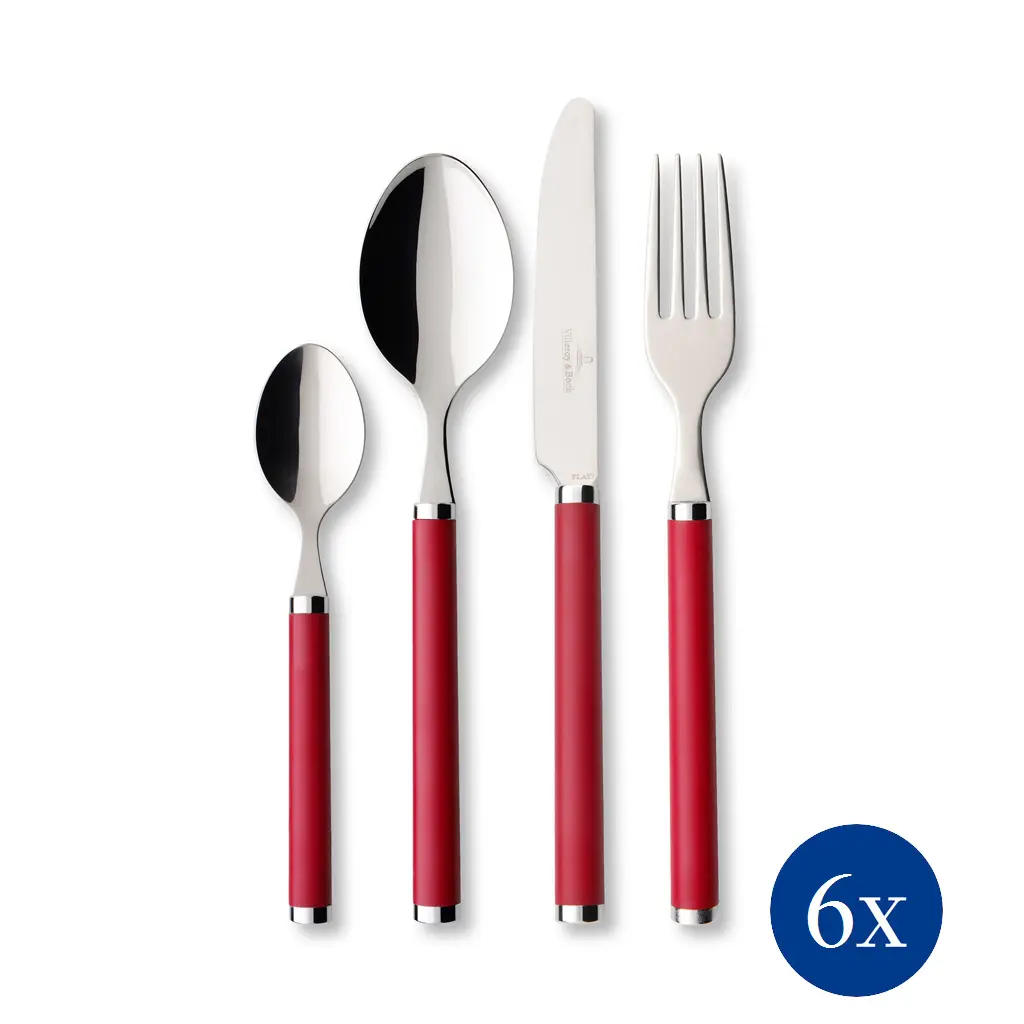 Komplet sztućców dla 6 osób w ilości 24 elementów w kolorze czerwonym z linii Play! firmy Villeroy & Boch to część kolekcji z rączkami z kolorowego tworzywa sztucznego, które świetnie pasują do naczyń w stylu country.