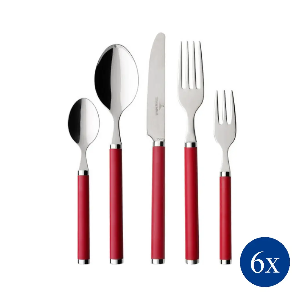 Komplet sztućców dla 6 osób w ilości 30 elementów w kolorze czerwonym z linii Play! firmy Villeroy & Boch to część kolekcji z rączkami z kolorowego tworzywa sztucznego, które świetnie pasują do naczyń w stylu country.