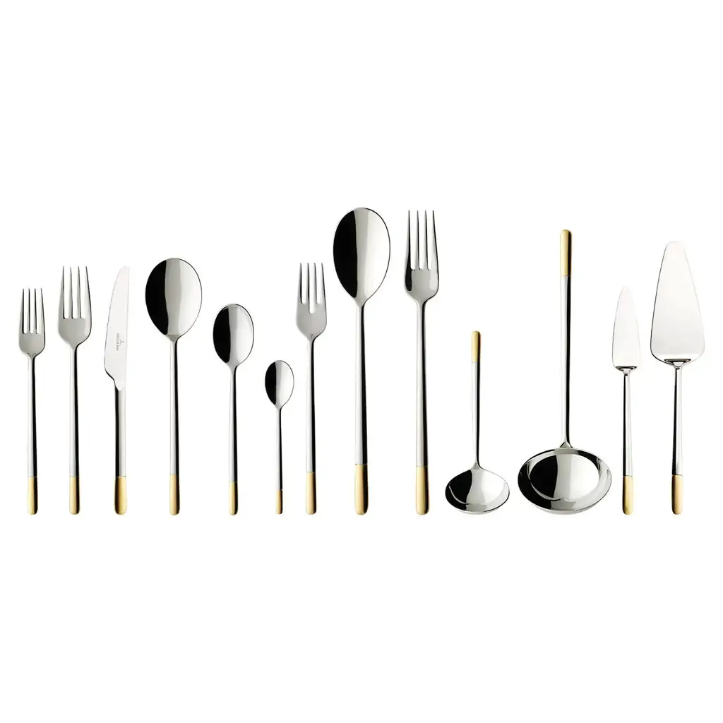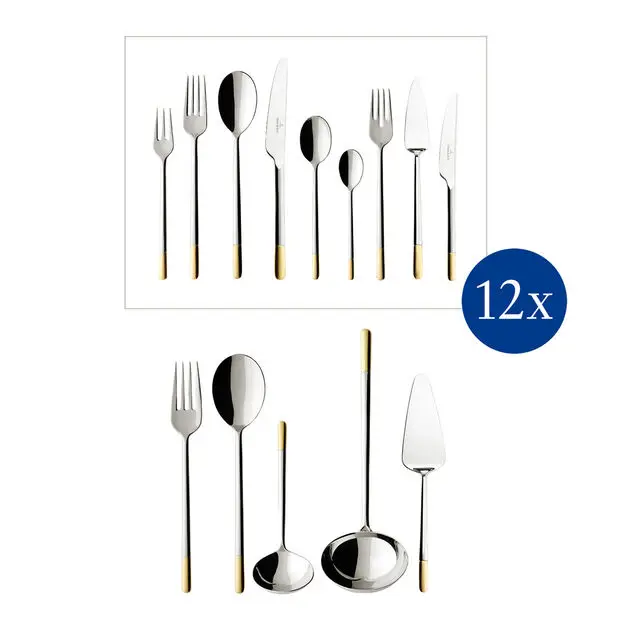 Częściowo pozłacany komplet sztućców dla 12 osób w ilości 113 elementów z linii Ella firmy Villeroy & Boch to część kolekcji, której wygląd zawsze sprawia niesamowite wrażenie na stole, dzięki pozłacanym elementom sztućców.