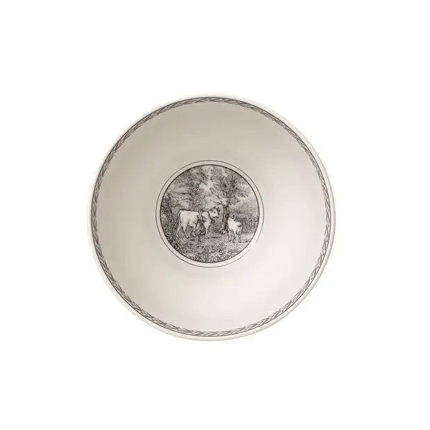 Miska o pojemności 650 ml z kolekcji Audun Ferme to część serwisu wiejskiego od firmy Villeroy & Boch. Scenki rodzajowe umieszczone na porcelanie są wzorowane na rysunkach sprzed 200 lat i przyciągają wzrok podczas towarzyskich spotkań. Jest on doskonałym uzupełnieniem kolekcji Audun (Femme, Promenade, Fleur oraz Chase).