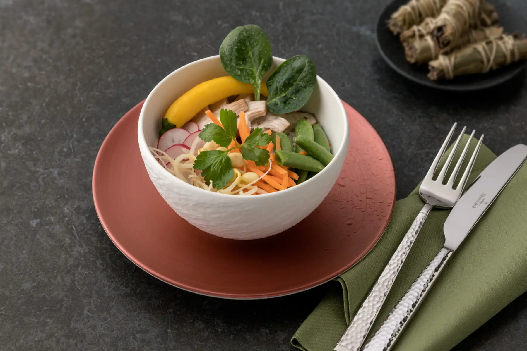 Prezentowana miska do zupy o wymiarach 12,7 x 6,3 cm i pojemności 300 ml wykonana została z barwionej w masie na czystą biel porcelany Premium. Ma ona matowe wykończenie i lekko chropowatą, reliefową fakturę zainspirowaną unikalnym, naturalnym wyglądem łupku. Miska doskonale nada się na różne okazje - od codziennych posiłków po specjalne spotkania, umożliwiając podawanie zup, innych płynnych dań czy przekąsek, a przy tym elegancko zaprezentuje się na stole. Produkt nadaje się do używania w kuchence mikrofalowej oraz mycia w zmywarce.