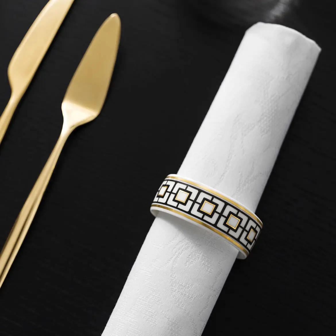 Obrączka na serwetkę MetroChic to niezwykle elegancka ozdoba na stół. Wszystkie elementy wysokojakościowej kolekcji zastawy stołowej i upominków MetroChic mogą być łączone ze sobą na wiele różnych sposobów. Szlachetna i wyjątkowo odporna Premium Bone Porcelain zmienia każdy stół w ikonę nowoczesnego stylu o ponadczasowej elegancji. Eleganckie obrączki na serwetki dopełniają piękną aranżację stołu i dzięki technologii „Inglaze Gold” przez długi czas będą cieszyć oko wspaniałym dekorem. Ciesz się miejskim designem lub spraw radość innym, obdarowując ich tym eleganckim produktem.