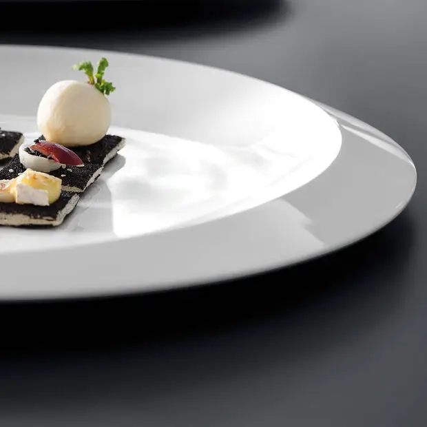 Półmisek do prezentacji o średnicy 37 cm z serii NewMoon ma charakterystyczną krawędź w postaci wąskiego półksiężyca, a lekka asymetria wyznacza wyraźny charakter kolekcji.
