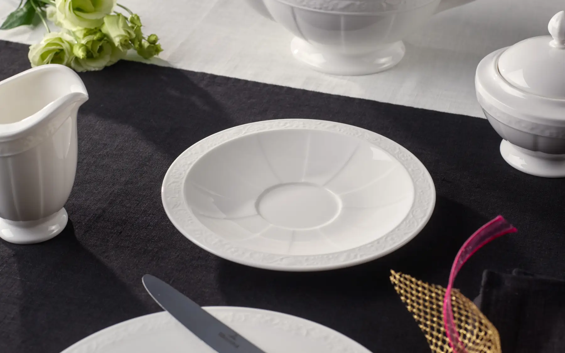 Minimalistyczny spodek z pełnym gracji kwiecistym reliefem przy krawędzi jest idealny w komplecie z filiżanką śniadaniową White Pearl. Został wykonany z najwyższej jakości porcelany Premium z której słynie marka Villeroy&Boch. Powściągliwa forma wpasuje się zarówno do tradycyjnych jak i nowoczesnych wystrojów. Elegancki fason White Pearl jest odzwierciedleniem ekskluzywnego stylu życia.