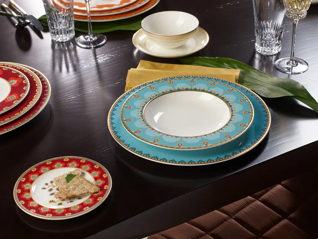 Talerz głęboki o średnicy 246 mm z linii Samarkand Aquamarin od Villeroy & Boch to część serwisu, w którym delikatne zdobienia oraz orientalny, wyrafinowany przepych łączą się w bajkowe kompozycje na zastawionym stole.
