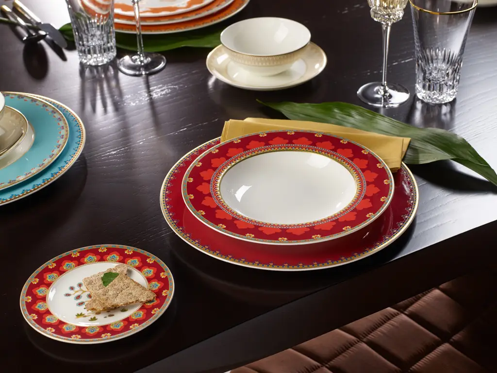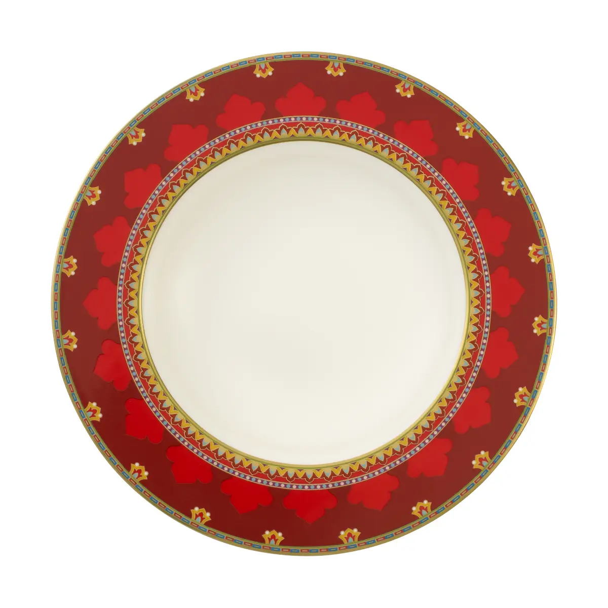 Talerz głęboki o średnicy 246 mm z linii Samarkand Rubin od Villeroy & Boch to część serwisu, w którym delikatne zdobienia oraz orientalny, wyrafinowany przepych łączą się w bajkowe kompozycje na zastawionym stole.