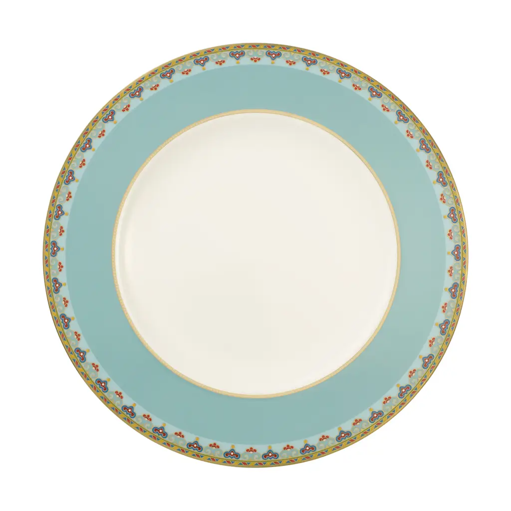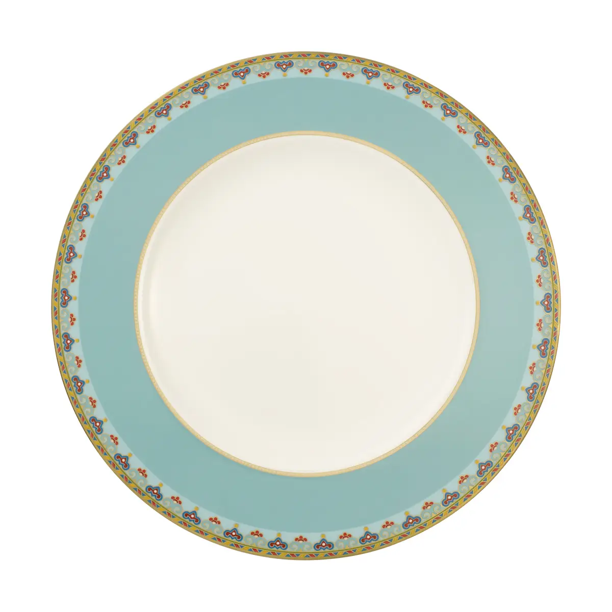 Talerz obiadowy o średnicy 277 mm z linii Samarkand Aquamarin od Villeroy & Boch to część serwisu, w którym delikatne zdobienia oraz orientalny, wyrafinowany przepych łączą się w bajkowe kompozycje na zastawionym stole.