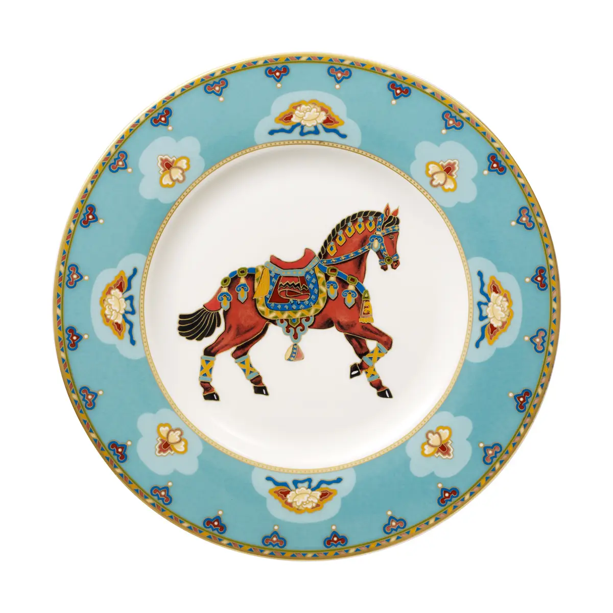 Piękny talerz w orientalnym stylu. Jedynie kolory mogły by być bardziej intensywne zwłaszcza te na koniu - w rzeczywistości nie jest on brązowo-czerwony ale różowy.