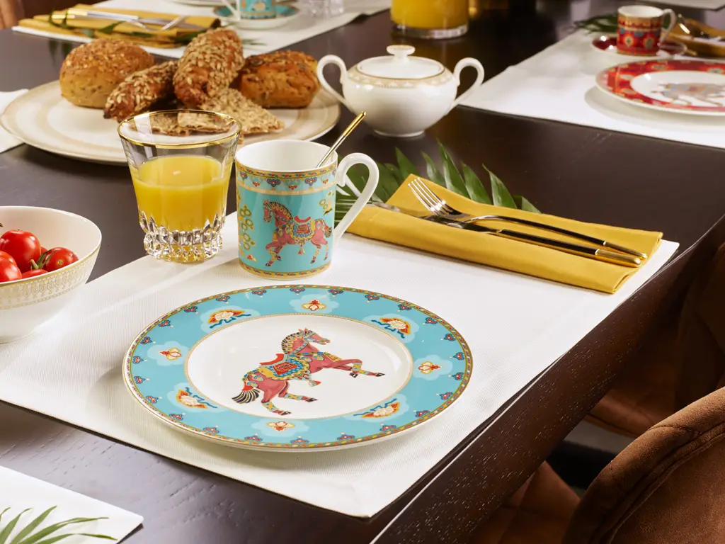 Wzory z kolekcji Samarkand potrafią jednocześnie pokazać się i zachwycać: powściągliwa elegancja ma charakter reprezentacyjny, a żywe kolory zachwycają. Zastawa Samarkand Aquamarin nadaje udanej serii jasnoniebieski akcent kolorystyczny.