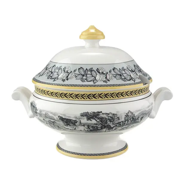 Waza z pokrywką o pojemności 2 litrów z kolekcji Audun Ferme to część serwisu wiejskiego od firmy Villeroy & Boch. Scenki rodzajowe umieszczone na porcelanie są wzorowane na rysunkach sprzed 200 lat i przyciągają wzrok podczas towarzyskich spotkań. Produkt jest doskonałym uzupełnieniem kolekcji Audun (Femme, Promenade, Fleur oraz Chase).