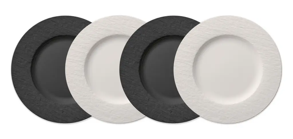 Prezentowany zestaw talerzy składa się z 4 talerzy śniadaniowo-deserowych o średnicy 22 cm. Wykonano je z barwionej w masie na głęboką czerń/czystą biel porcelany Premium. Mają one lekko chropowatą, reliefową fakturę zainspirowaną unikalnym, naturalnym wyglądem łupku. Zestaw idealnie nadaje się na różne okazje sprawdzając się od codziennych posiłków po specjalne spotkania czy wydarzenia. Talerze nadają się do używania w kuchence mikrofalowej oraz mycia w zmywarce.