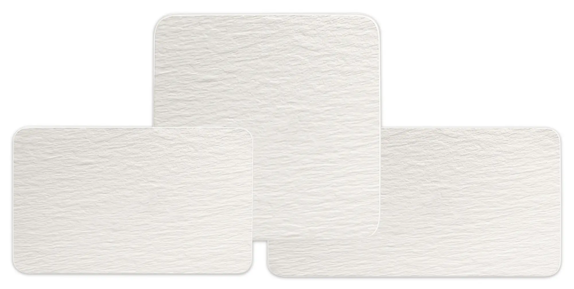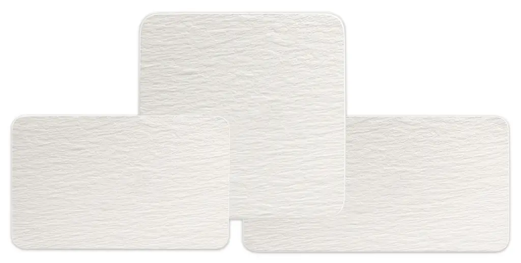 Prezentowany zestaw do serwowania składa się z półmiska o wymiarach 28 x 17 cm, półmiska o wymiarach 35 x 18 cm oraz talerza kwadratowego o wymiarach 32 x 32 cm. Wszystkie jego elementy wykonano z barwionej w masie na czystą biel porcelany Premium. Mają one lekko chropowatą, reliefową fakturę zainspirowaną unikalnym, naturalnym wyglądem łupku. Zestaw idealnie nadaje się na różne okazje sprawdzając się od codziennych posiłków po specjalne spotkania czy wydarzenia. Wszystkie elementy nadają się do używania w kuchence mikrofalowej oraz mycia w zmywarce.