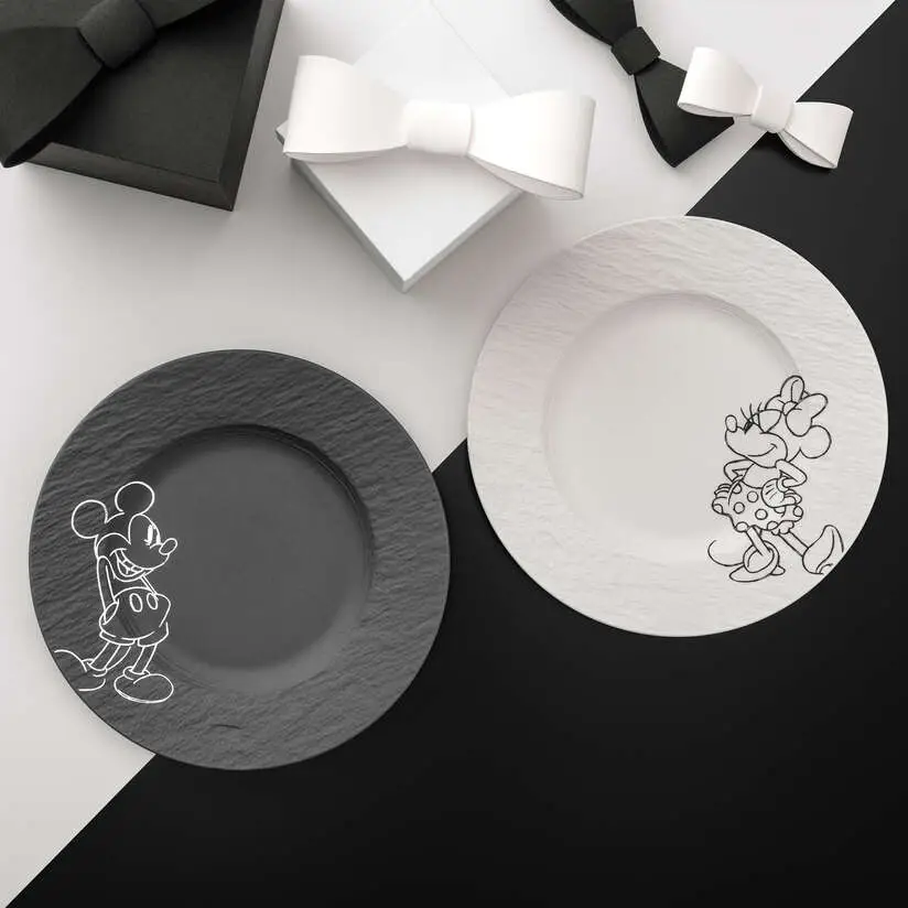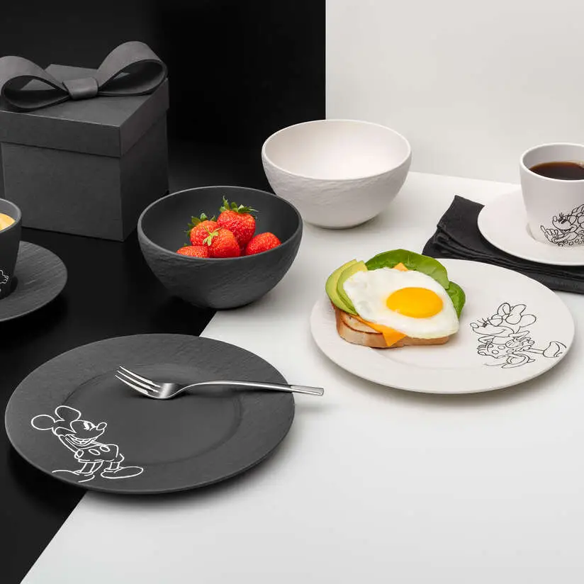 Talerze Manufacture – Mickey Mouse od Villeroy&Boch to wyjątkowe połączenie elegancji i nowoczesnego designu. Minimalistyczna czerń i biel w zestawieniu z kultowym motywem Disneya tworzą stylowy element każdej zastawy.