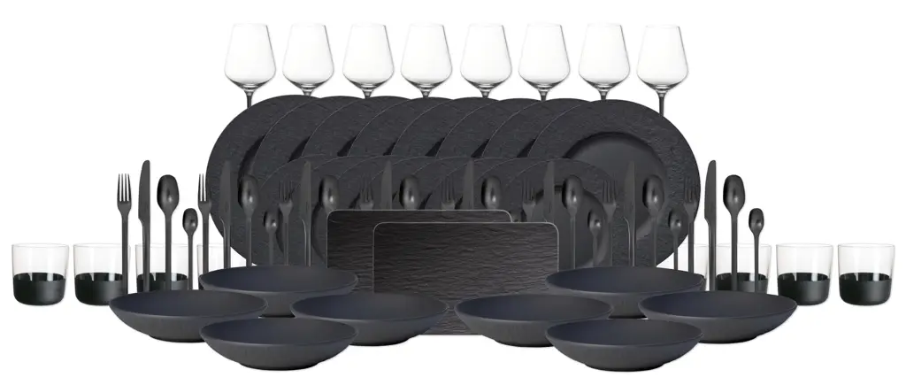 Prezentowany zestaw obiadowy dla 8 osób składa się z 8 talerzy obiadowych o średnicy 27 cm, 8 talerzy deserowych o średnicy 22 cm, 8 misek płaskich o wymiarach 23,5 x 5 cm i pojemności 430 ml, 8 szklanek do napojów o pojemności 250 ml, 8 kieliszków do czerwonego wina o pojemności 200 ml oraz 2 prostokątnych półmisków do serwowania o wymiarach 28 x 16,9 x 1,4 cm. Talerze, miski i półmiski wykonano z barwionej w masie na głęboką czerń porcelany Premium i mają one lekko chropowatą, reliefową fakturę zainspirowaną unikalnym, naturalnym wyglądem łupku. Szklanki i kieliszki zrobiono ze szkła kryształowego z czarnymi elementami. Zestaw doskonale sprawdzi się na różne okazje od codziennych posiłków po specjalne spotkania czy wydarzenia. Talerze, miski i półmiski nadają się do używania w kuchence mikrofalowej oraz mycia w zmywarce. Szklanki i kieliszki należy myć wyłącznie ręcznie.