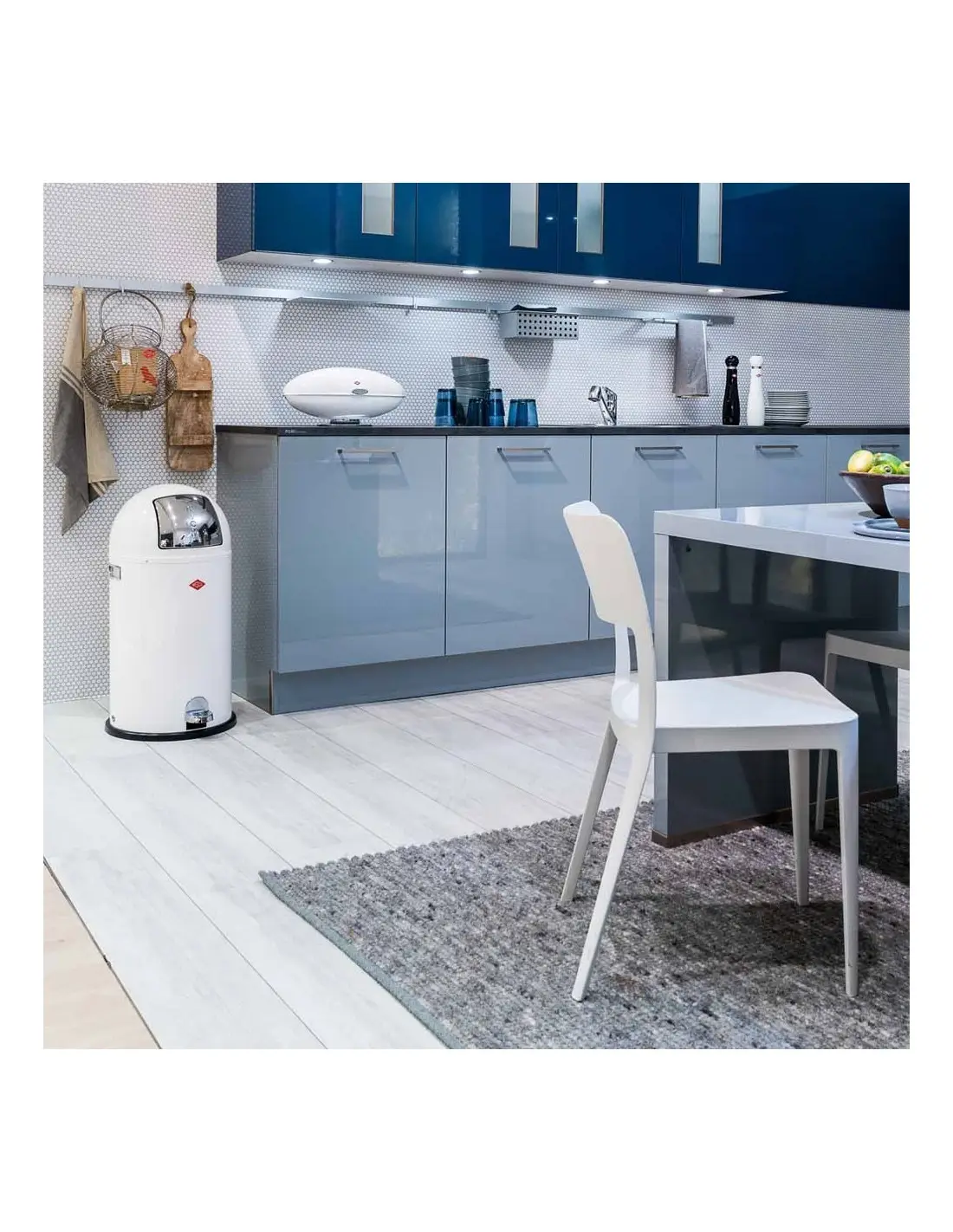 Kosz KICKBOY marki WESCO o pojemności 40 litrów charakteryzuje się klasycznym wyglądem. Wykonany jest z wysokiej jakości blachy lakierowanej malowanej proszkowo. Posiada stalową klapę w srebrnym kolorze z wygrawerowanym napisem „KICK”, otwierana jest ona za pomocą mechanizmu pedałowego. Na podstawie kosza znajduje się plastikowa obręcz – chroni ona podłogę przed zarysowaniami i pobrudzeniem. W środku znajduje się metalowy wkład. Dzięki solidnemu wykonaniu produkt będzie służył przez wiele lat.
