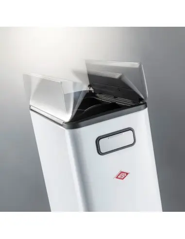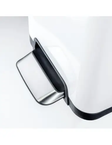 Dwukomorowy pojemnik na śmieci z mechanizmem otwierania znajdzie swoje zastosowanie w każdej nowoczesnej kuchni. Daje on możliwość segregacji odpadów. Jego korpus wykonany został ze stali lakierowanej proszkowo, natomiast składane uchwyty, pedał mechanizmu i dwuczęściowe wieko - ze stali nierdzewnej polerowanej. Kosz wyposażony jest w plastikowy, dwukomorowy wkład na odpady, co umożliwia łatwe opróżnianie kosza i utrzymanie w czystości. Posiada też blokadę wieka, co umożliwia pozostawienie je w pozycji otwartej. Pod spodem pojemnika znajdują się kółka.
