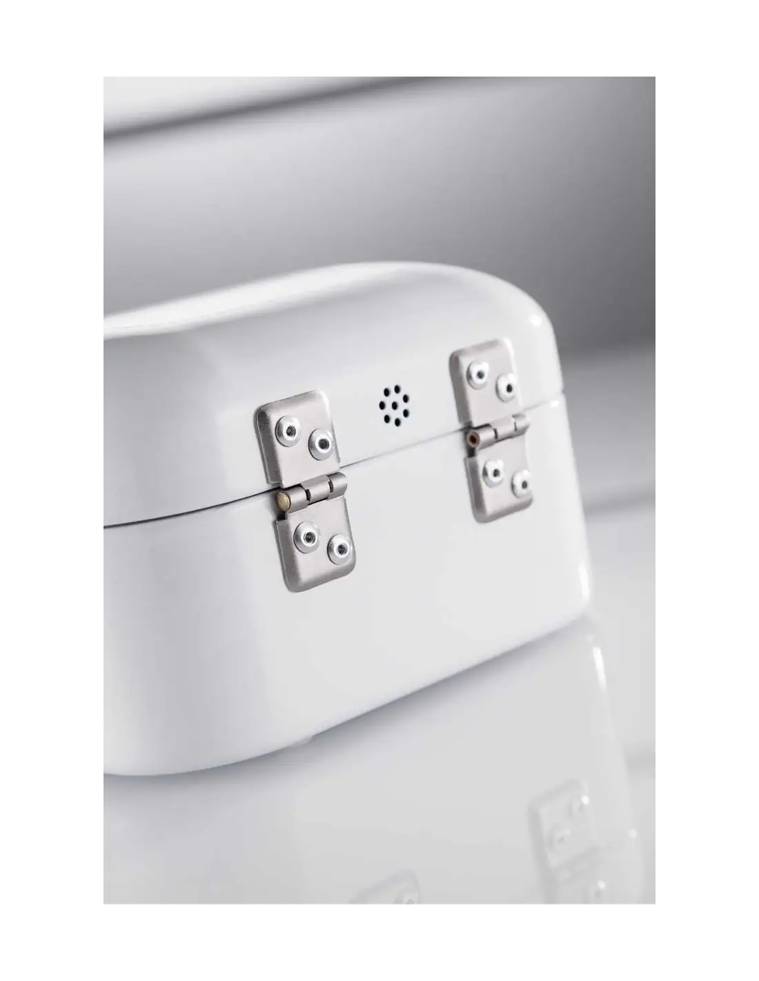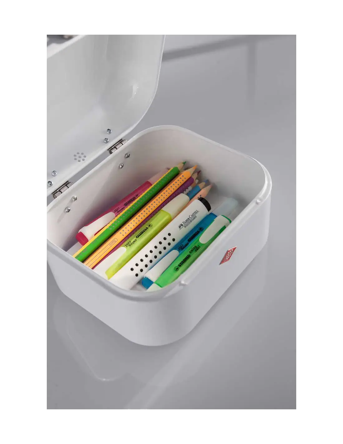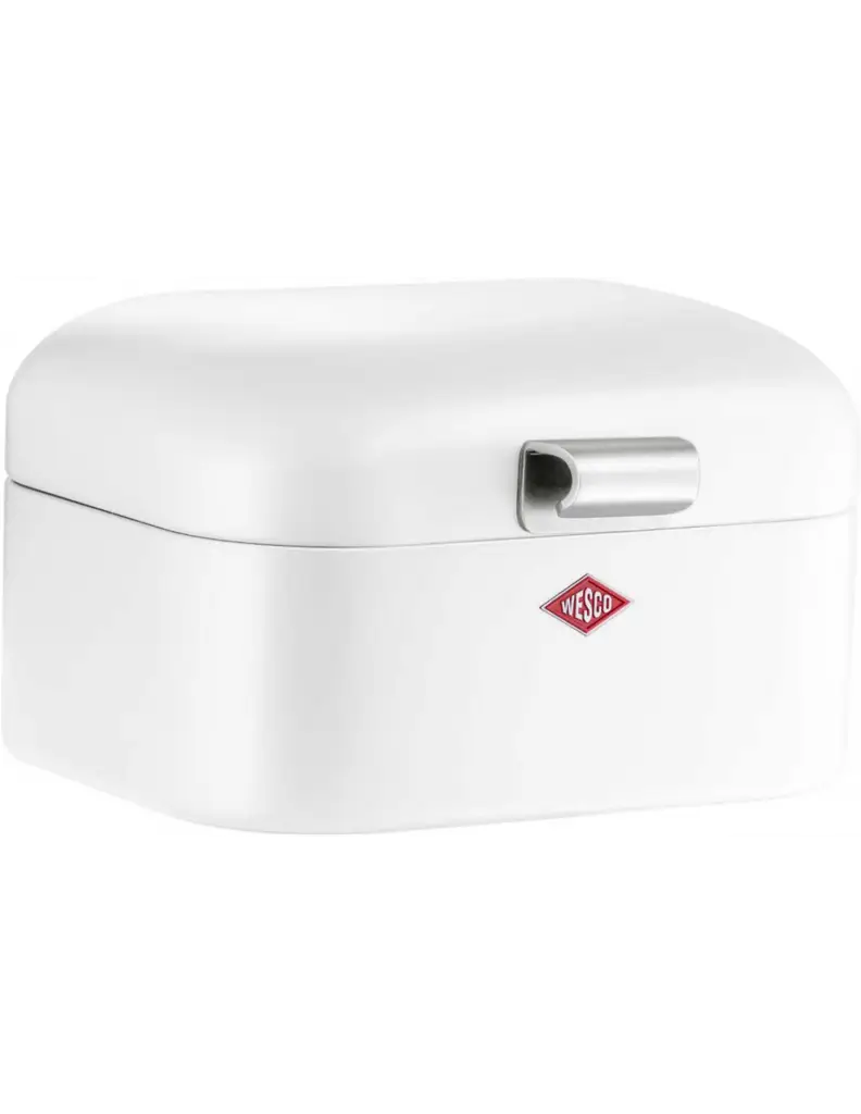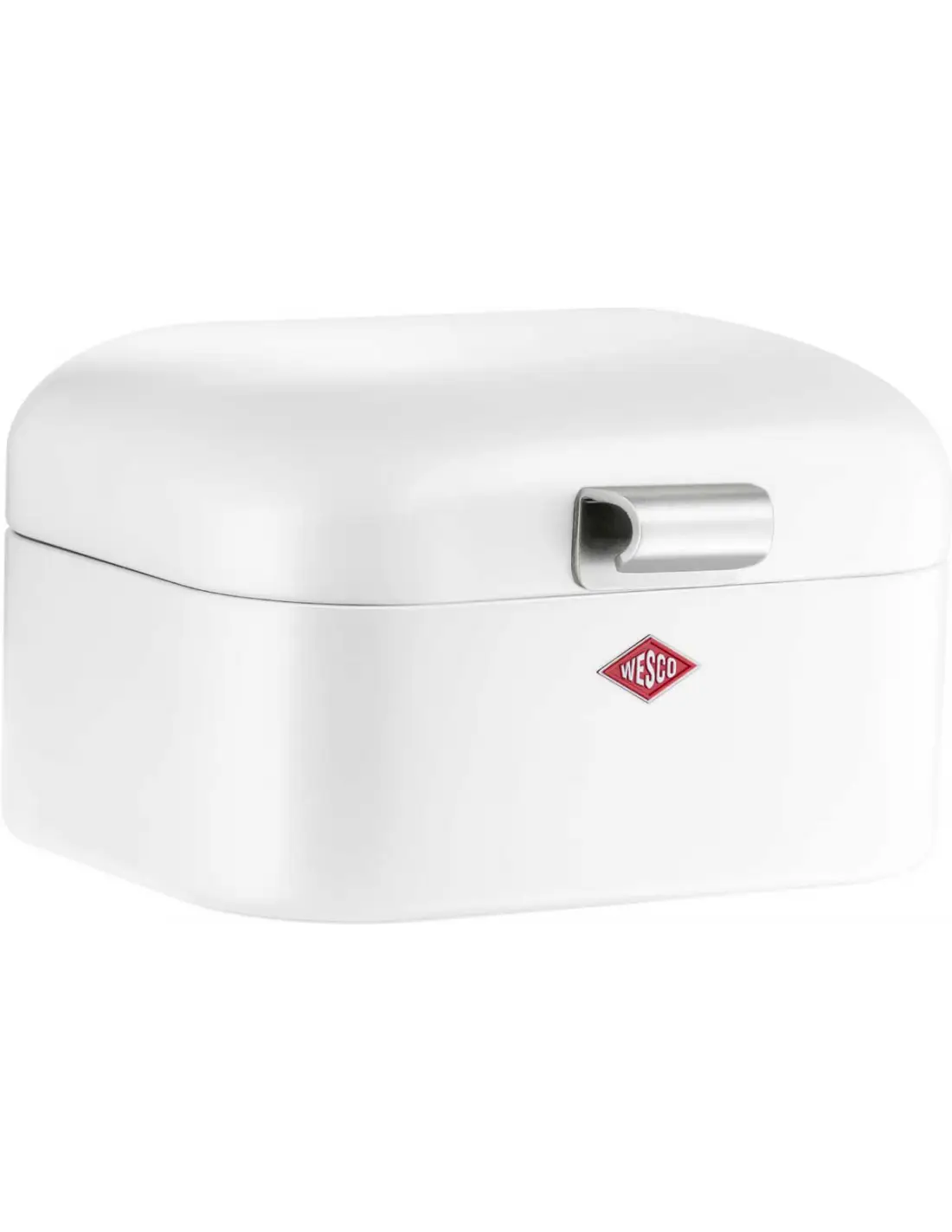 Pojemnik Mini Grandy to mniejsza wersja chlebaka z tej samej kolekcji marki Wesco. Służy do przechowywania kredek, artykułów biurowych, a także ciasteczek, kanapek i innych artykułów spożywczych. Pudełko posiada ergonomiczny stalowy uchwyt do otwierania wieczka, które przymocowane jest za pomocą zawiasów. Produkt wykonany jest ze stali lakierowanej proszkowo. Nie nadaje się do mycia w zmywarce. Otwory wentylacyjne umieszczone z tyłu pojemnika zapewniają cyrkulację powietrza, dzięki czemu przechowywane w nim artykuły spożywcze zachowują dłużej świeżość.