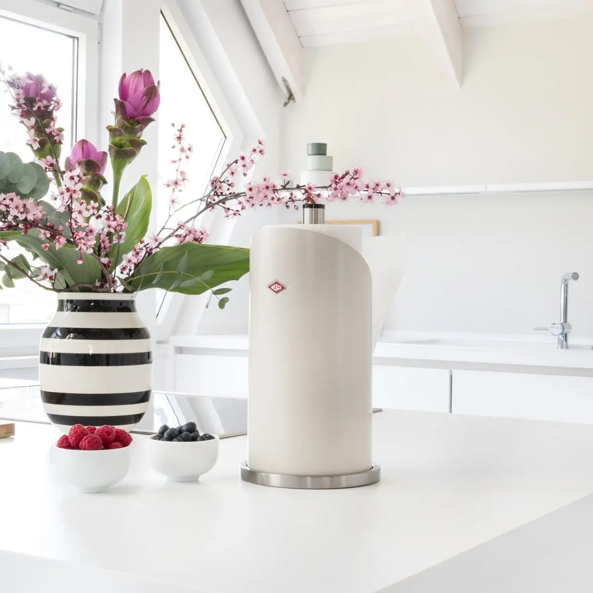 Stojak na papier marki Wesco prezentuje się niezwykle elegancko - prosty design i wyraziste kolory sprawiają, że będzie on ozdobą każdej kuchni. Wykonana z wysokiej jakości stali nierdzewnej podstawa i pręt gwarantują stabilność oraz wieloletnie użytkowanie produktu. Obudowa ze stali lakierowanej jest estetyczna oraz odporna na zarysowania. Stojak idealnie nadaje się na 2 – 3 rolki papieru toaletowego lub jeden standardowy ręcznik papierowy. Produkt należy czyścić wilgotną ściereczką, nie zaleca się mycia go w zmywarce.