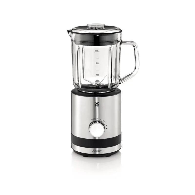 Czasem przed podaniem na stół, trzeba coś zmiksować. Mały blender z dzbankiem KitchenMinis 0,8L ze stali Cromargan przekonuje mocnym silnikiem: 400 watów, 20 000 obr/min, 241 km/h. W zależności od wymagań dostępnych jest pięć poziomów prędkości i jeden poziom impulsu. Dzięki WMF Perfect Cut mikser jest wyposażony w nóż z 6 ostrzami ze stali nierdzewnej. Wyjmowany szklany dzbanek o pojemności 0,8 litra z praktyczną pokrywką z otworem do napełniania i zintegrowanym dozownikiem ułatwia aplikację. Gumowane nóżki gwarantują bezpieczny montaż.