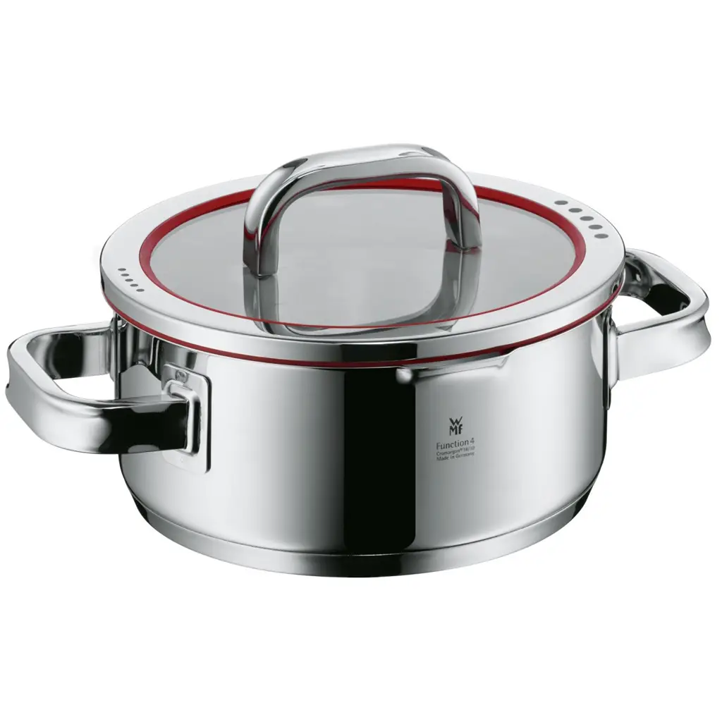 Garnek Function 4 niemieckiego producenta WMF wyróżnia się wyjątkową trwałością i odpornością na zużycie. W garnku Function 4 z pokrywą 20 cm firmy WMF krawędź jest szczególnie wysoka, nic nie wylewa się podczas gotowania mięsa. Również bez problemu w garnku można gotować makaron, ziemniaki, pierogi czy warzywa. Uchwyty, które dłużej pozostają zimne, szeroka krawędź do nalewania i pokrywka wyposażona w regulację odprowadzania pary i odcedzania z możliwością umieszczenia jej w 4 pozycjach. Garnki mają podstawę kuchenną TransTherm® zapewniającą równomierne rozprowadzanie ciepła i długi okres magazynowania ciepła.