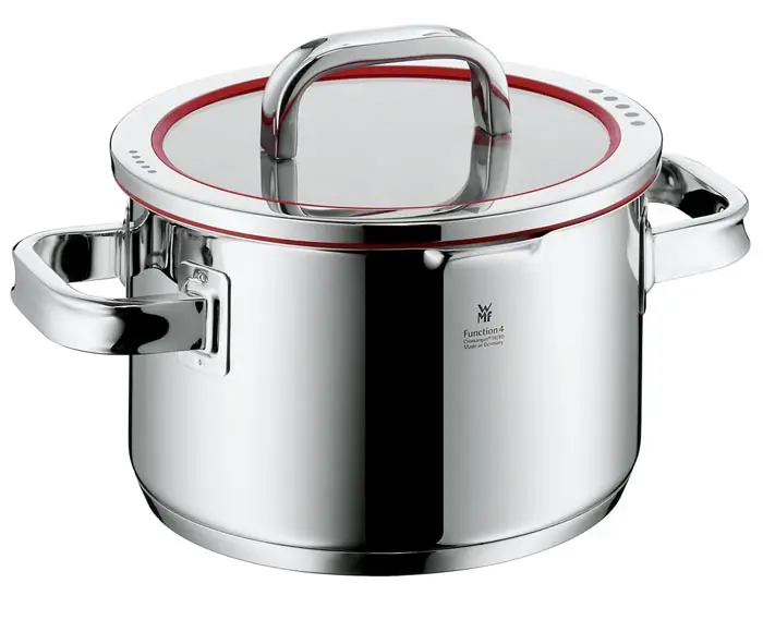 Garnek Function 4 niemieckiego producenta WMF wyróżnia się wyjątkową trwałością i odpornością na zużycie. W garnku Function 4 z pokrywą 20 cm firmy WMF krawędź jest szczególnie wysoka, nic nie wylewa się podczas gotowania. Uchwyty, które dłużej pozostają zimne, szeroka krawędź do nalewania i pokrywka wyposażona w regulację odprowadzania pary i odcedzania z możliwością umieszczenia jej w 4 pozycjach. Podstawa garnka TransTherm® zapewnia równomierne rozprowadzanie ciepła i długi okres magazynowania ciepła.