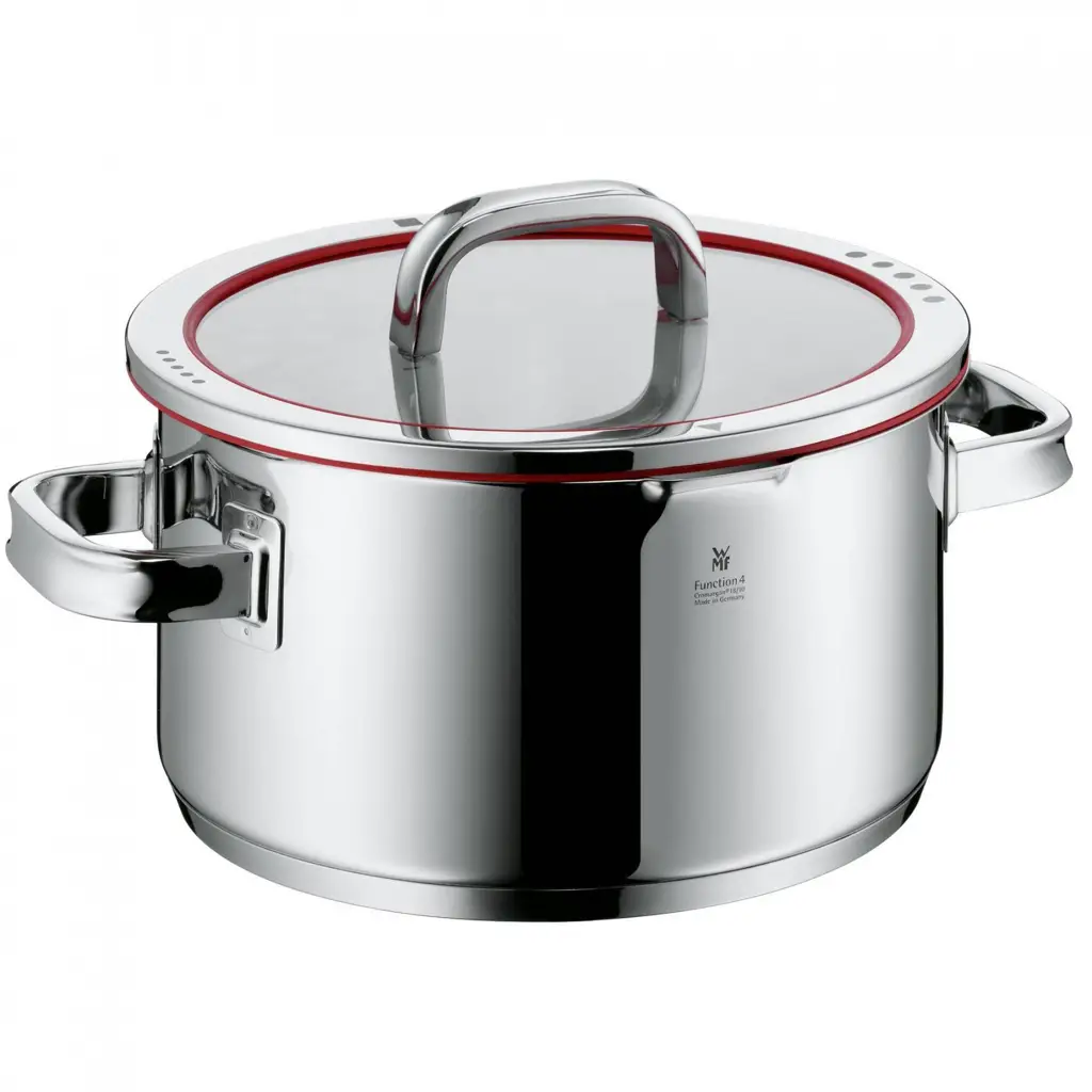 Garnek Function 4 niemieckiego producenta WMF wyróżnia się wyjątkową trwałością i odpornością na zużycie. W garnku Function 4 z pokrywą 24 cm firmy WMF krawędź jest szczególnie wysoka, nic nie wylewa się podczas gotowania mięsa. Również bez problemu w garnku można gotować makaron, ziemniaki, pierogi czy warzywa. Uchwyty, które dłużej pozostają zimne, szeroka krawędź do nalewania i pokrywka wyposażona w regulację odprowadzania pary i odcedzania z możliwością umieszczenia jej w 4 pozycjach. Garnki mają podstawę kuchenną TransTherm® zapewniającą równomierne rozprowadzanie ciepła i długi okres magazynowania ciepła.