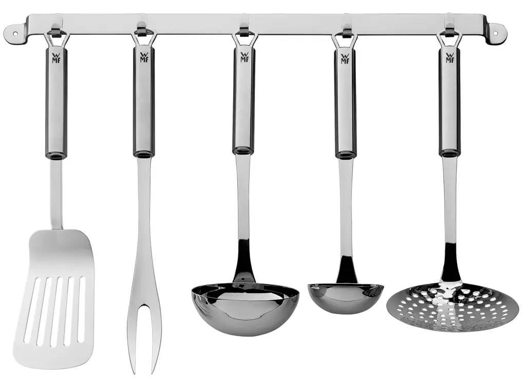 W tym niezawodnym komplecie państwo odnajdą łopatkę, łopatkę cedzakową, chochle do zupy, chochlę do sosu oraz duży widelec do mięs. Dodatkowo w skład kompletu dołączona została listwa, którą możemy zamontować i powiesić na niej wszystkie narzędzia dzięki temu, że każde z elementów posiada oczko pozwalające na umieszczenie ich na haczyku.