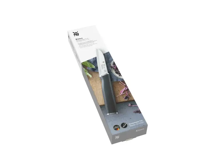 Najnowsza kolekcja Kineo od niemieckiej marki WMF Połączyła tym razem estetyczną formę noża w raz z funkcjonalnością i najwyższą jakością wykonania. Przy produkcji noża zastosowano najnowocześniejszą technologię oraz trenty w designie dzięki wieloletniej tradycji produkcji noży WMF. Nóż najlepiej sprawdzi się przy siekaniu owoców oraz warzyw.