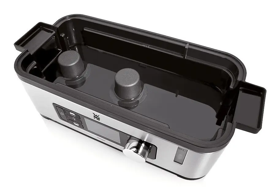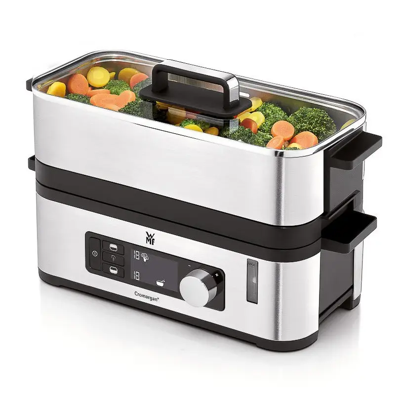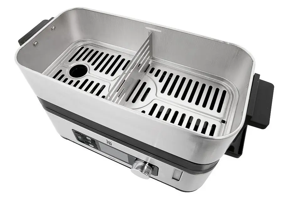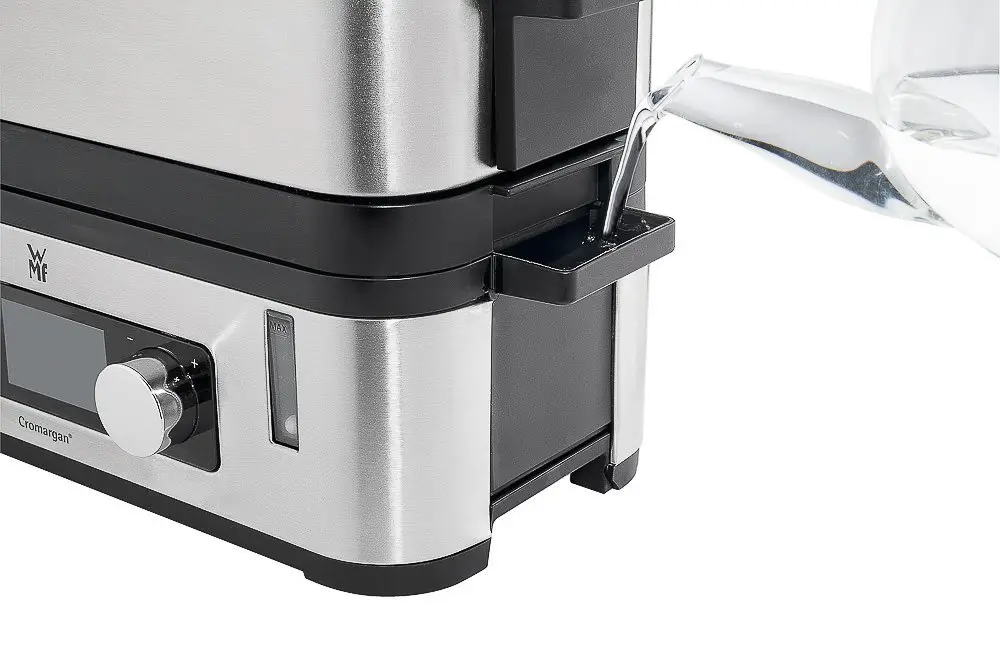 Specjalna wkładka umożliwia elastyczny podział miejsca we wnętrzu urządzenia. W skład zestawu wchodzi także wielofunkcyjna misa ze stali Cromargan® do przygotowywania ryżu, makaronu, a także zup. Z boku urządzenia znajduje się specjalny otwór, przez który z łatwością uzupełnimy wodę podczas gotowania.