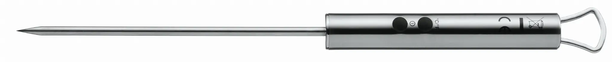 Elektroniczny termometr WMF z kolekcji Profi Plus jest wszechstronnym niezbędnikiem w każdej kuchni. Umożliwi on sprawdzenie temperatur potraw mięsnych czy ciasta w dziecinnie prosty sposób! TErmometr ma wyjątkowo szybki czas reakcji, wszystko co trzeba zrobić to wbić kocówkę "igłę" termomteru w produkt który właśnie przyrządzamy lub włożyć do pojemnika z napojem – by w ciągu 10 sekund ujrzeć dokładną temperaturę.